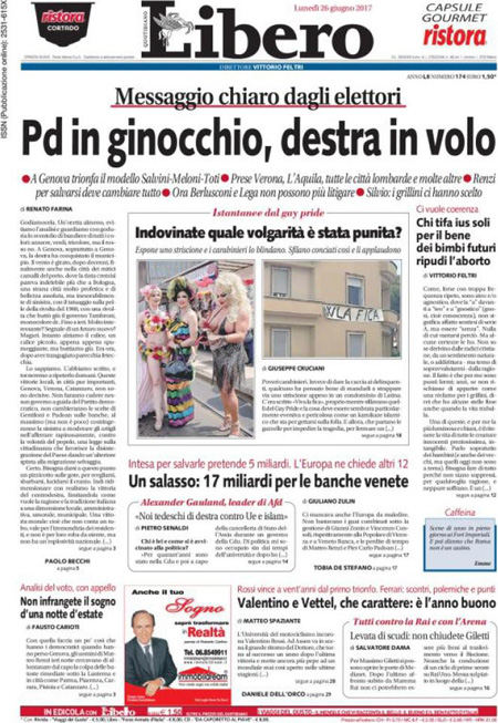 I risultati dei ballottaggi per le elezioni amministrative, con la vittoria, in quasi tutte le città, del centrodestra. Il decreto per il salvataggio delle banche venete. E Valentino Rossi che vince il MotoGP.