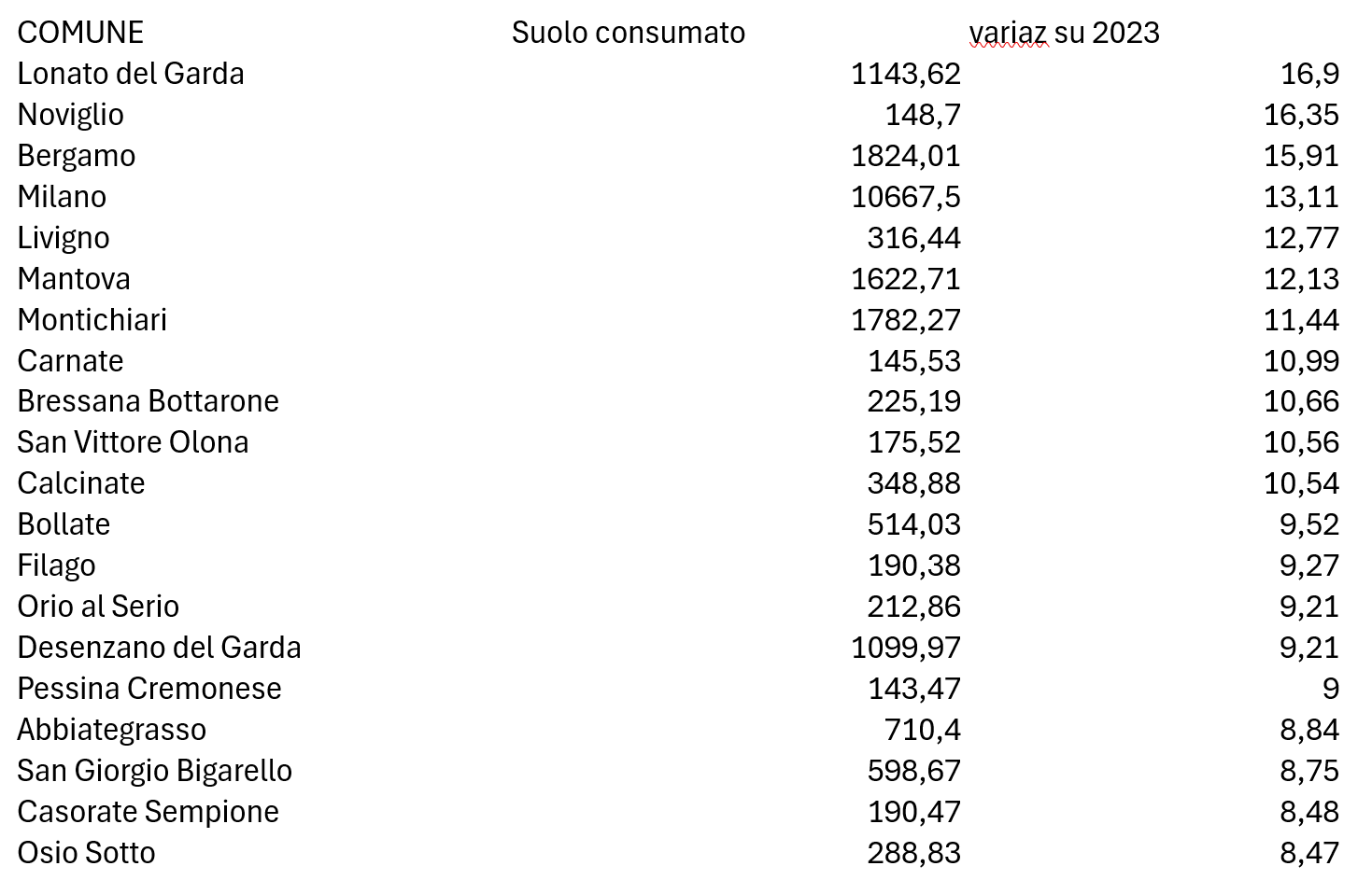 I comuni lombardi più interessati dal consumo di suolo nel 2024 – Tabella Legambiente su dati Ispra