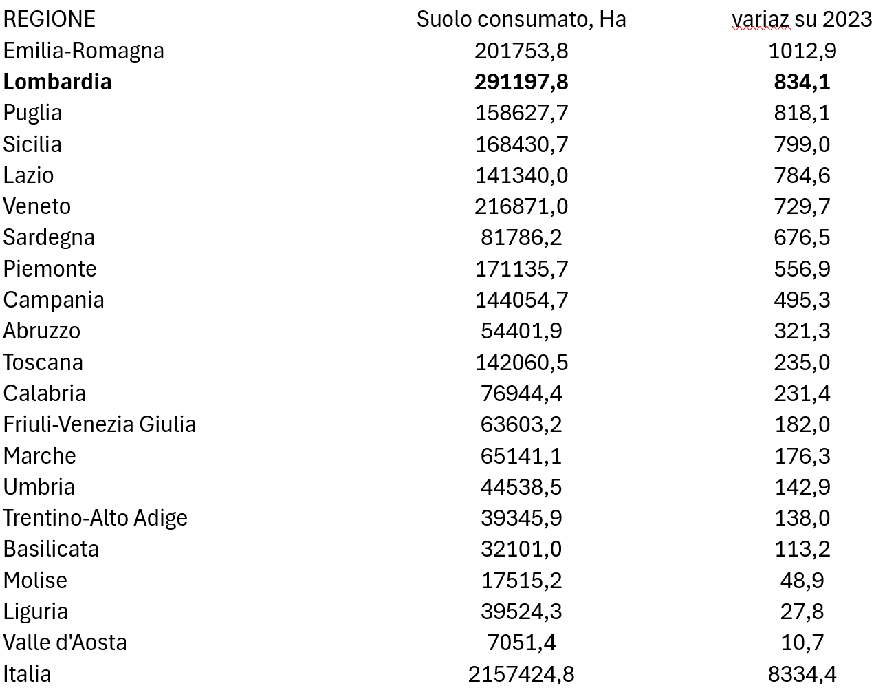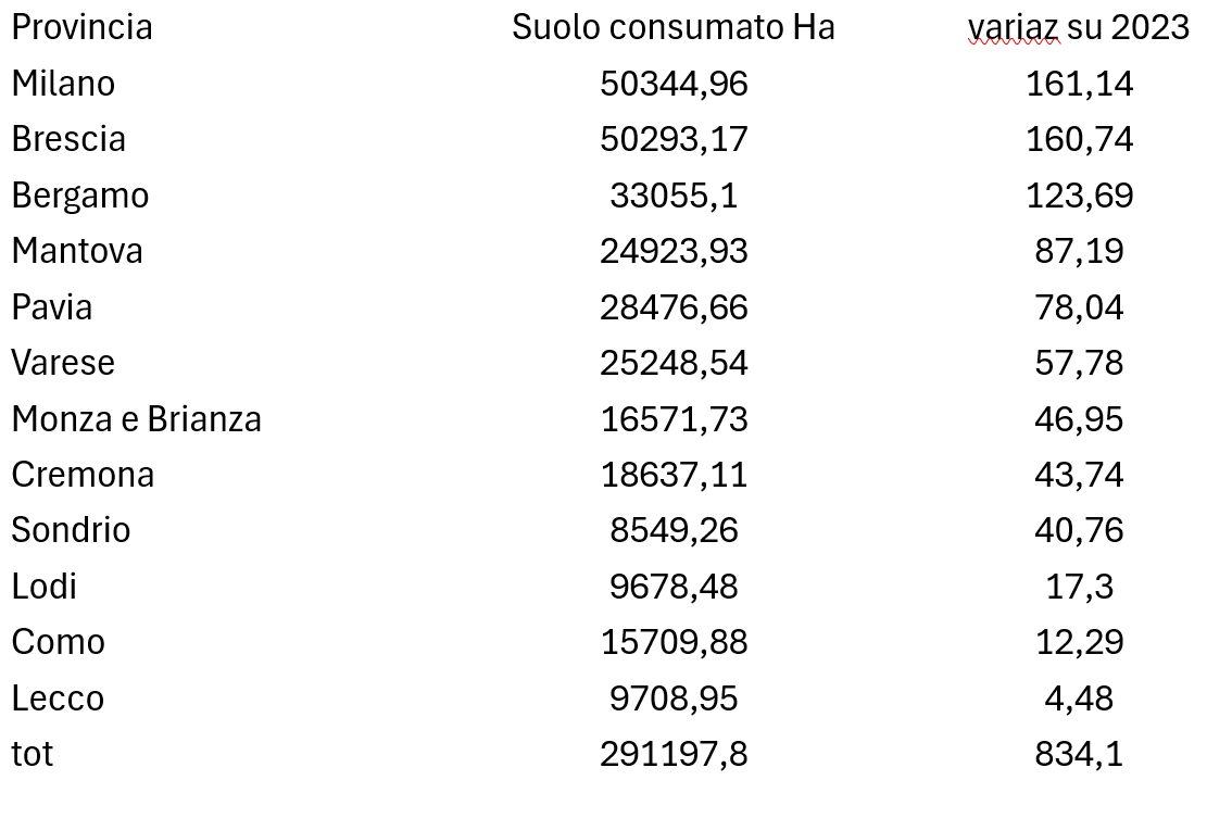Il consumo di suolo nelle province lombarde nel 2024 – Tabella Legambiente su dati Ispra