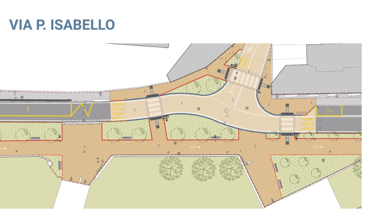 In via Isabello l’intervento interesserà circa 200 metri con nuovi spazi pedonali, percorsi ciclopedonali drenanti, aiuole e “rain gardens”, oltre a un plateau rialzato per aumentare la sicurezza in prossimità delle scuole.