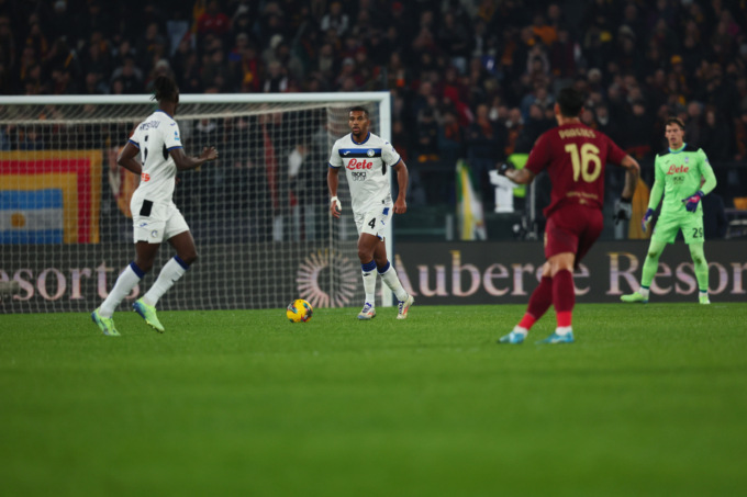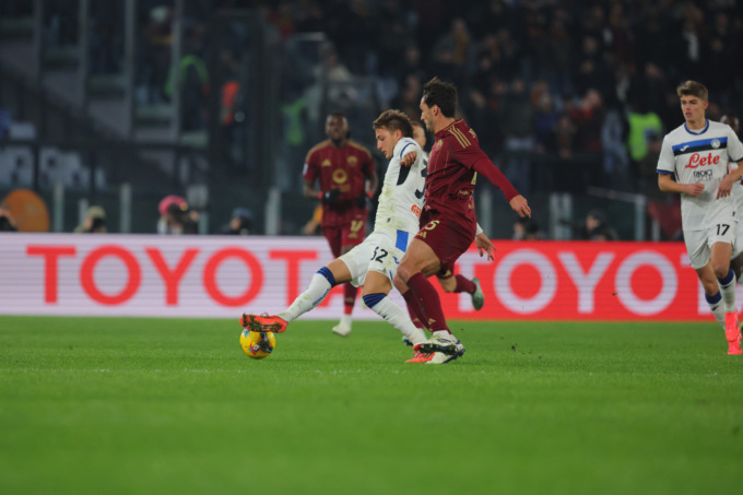 La gara inizia con l’Olimpico che saluta a gran voce Ranieri e Gasperini, squalificato, che si siede in Tribuna Stampa a 60 metri dal campo. Le squadre sembrano studiarsi e le prime due conclusioni sono dei padroni di casa: Paredes (5’, bella parata in tuffo di Carnesecchi) e Kone (14’, palo sfiorato) calciano da fuori area, ma sono troppo liberi e dalla panchina arriva il richiamo a una maggiore attenzione.