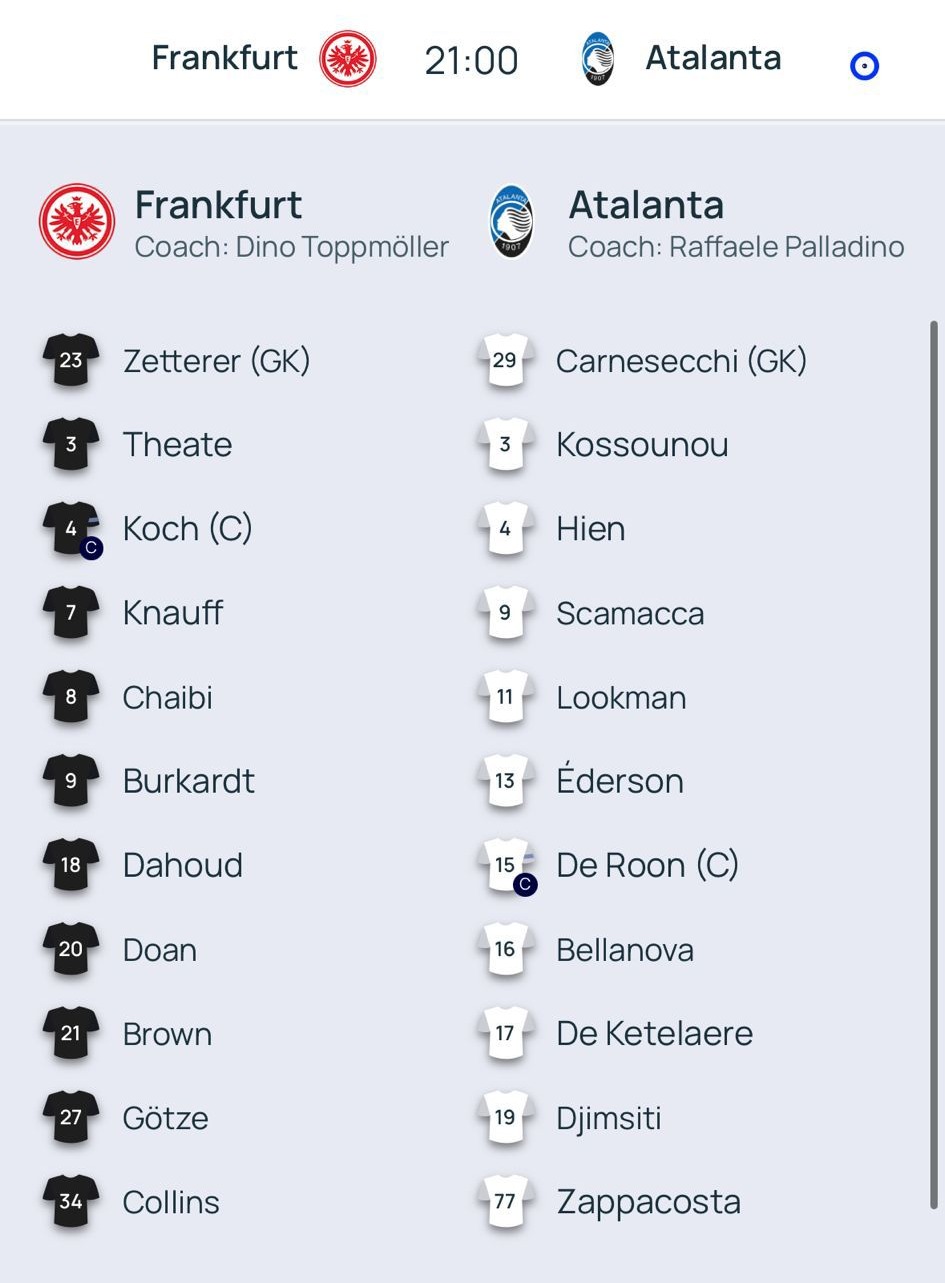 Sul 3-0, Palladino dà respiro a un po’ di giocatori: fuori Scamacca, Ederson e Zappacosta, dentro Krstovic, Musah e Zalewski. Doppio cambio anche nell’Eintracht: fuori Dahoud e Gotze, dentro Skhiri e Batshuayi.