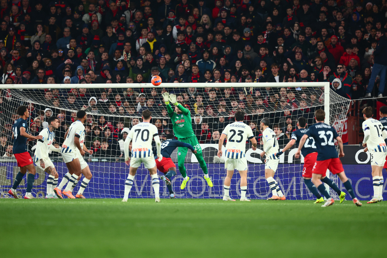 Scamacca batte la punizione cercando direttamente la porta ma non centra lo specchio. Sarà soltanto rinvio dal fondo per il Genoa nonostante le proteste dei giocatori nerazzurri.