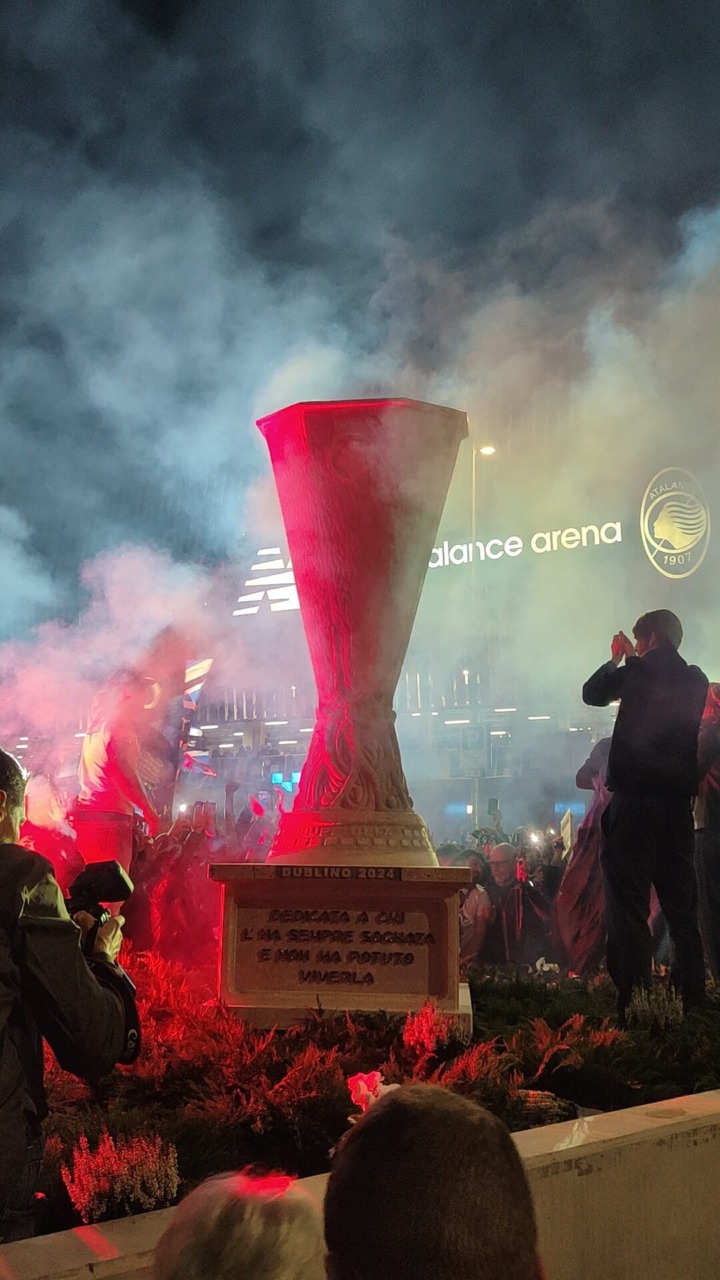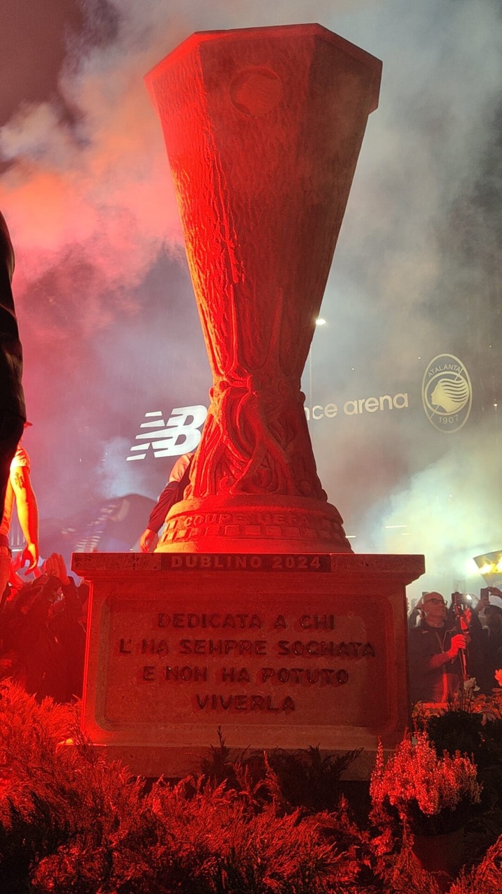 Alle 21:30 è arrivato il momento che il piazzale attendeva da mesi. Con la sindaca Elena Carnevali, il presidente Percassi, i giocatori e il mister Juric davanti, il velo è caduto dalla statua. Alta due metri e mezzo, pesante cinque tonnellate, realizzata da Nicola Trapattoni e Cristoforo Giorgi, la Coppa dell’Europa League in marmo si è rivelata in tutta la sua imponenza davanti alla Curva Sud. Il boato si è mescolato ai fumogeni che hanno colorato il cielo notturno, i cori hanno riempito ogni angolo del piazzale.