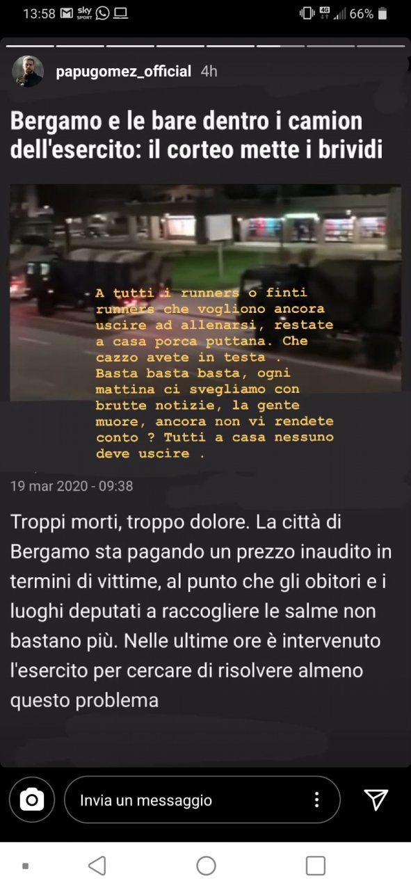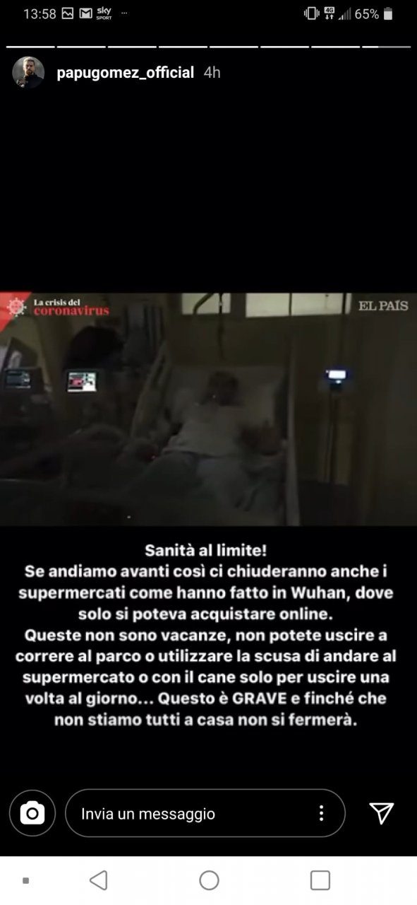 Lo stesso Gomez, poco dopo, ha pubblicato una seconda storia su Instagram, riprendendo un video pubblicato da El Pais sulla situazione di estrema difficoltà che sta vivendo l’ospedale San Marco di Zingonia. «Sanità al limite – ha scritto ancora Gomez -! Se andiamo avanti così ci chiuderanno anche i supermercati come hanno fatto in Wuhan, dove si poteva solo acquistare online. Queste non sono vacanze, non potete uscire e correre al parco, usare la scusa del supermercato o con il cane solo per uscire una volta al giorno. Questo è GRAVE e finché non stiamo tutti a casa non si fermerà».
