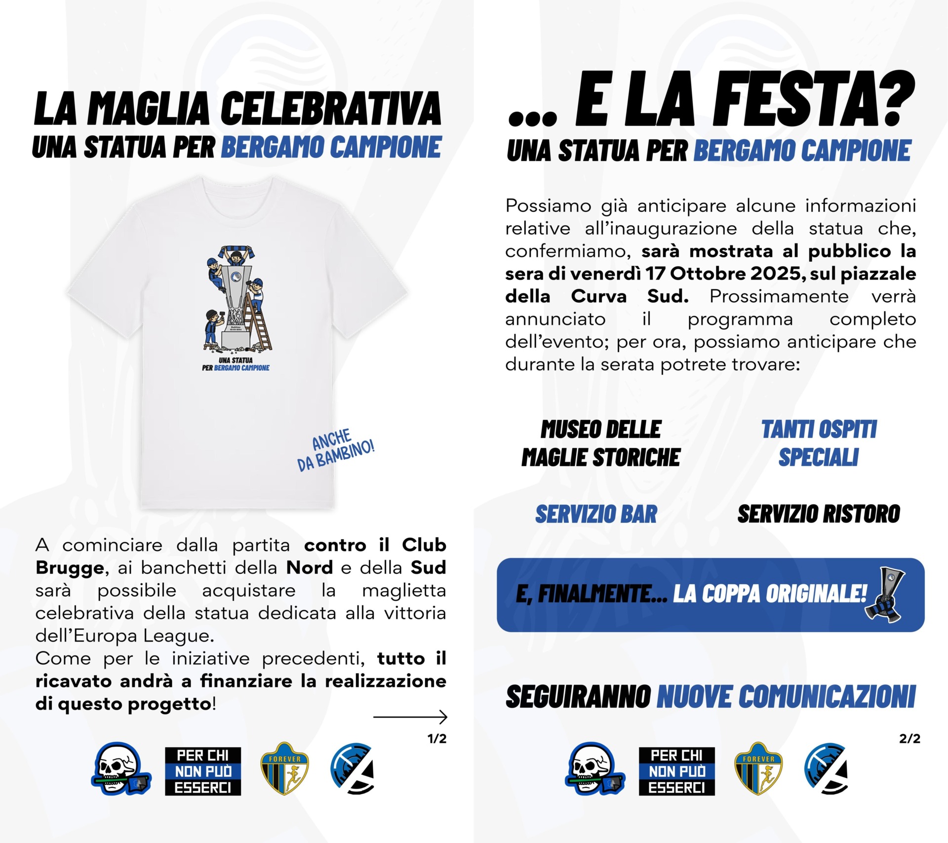La maglia, la coppa, la festa. Ieri sera (29 settembre), vigilia di Atalanta-Club Brugge, è circolato il volantino che annuncia la vendita di una maglietta celebrativa in vista della festa che inaugurerà, il prossimo 17 ottobre, la statua in ricordo del successo in Europa League che sarà posizionata sul piazzale della Curva Sud, a Bergamo.