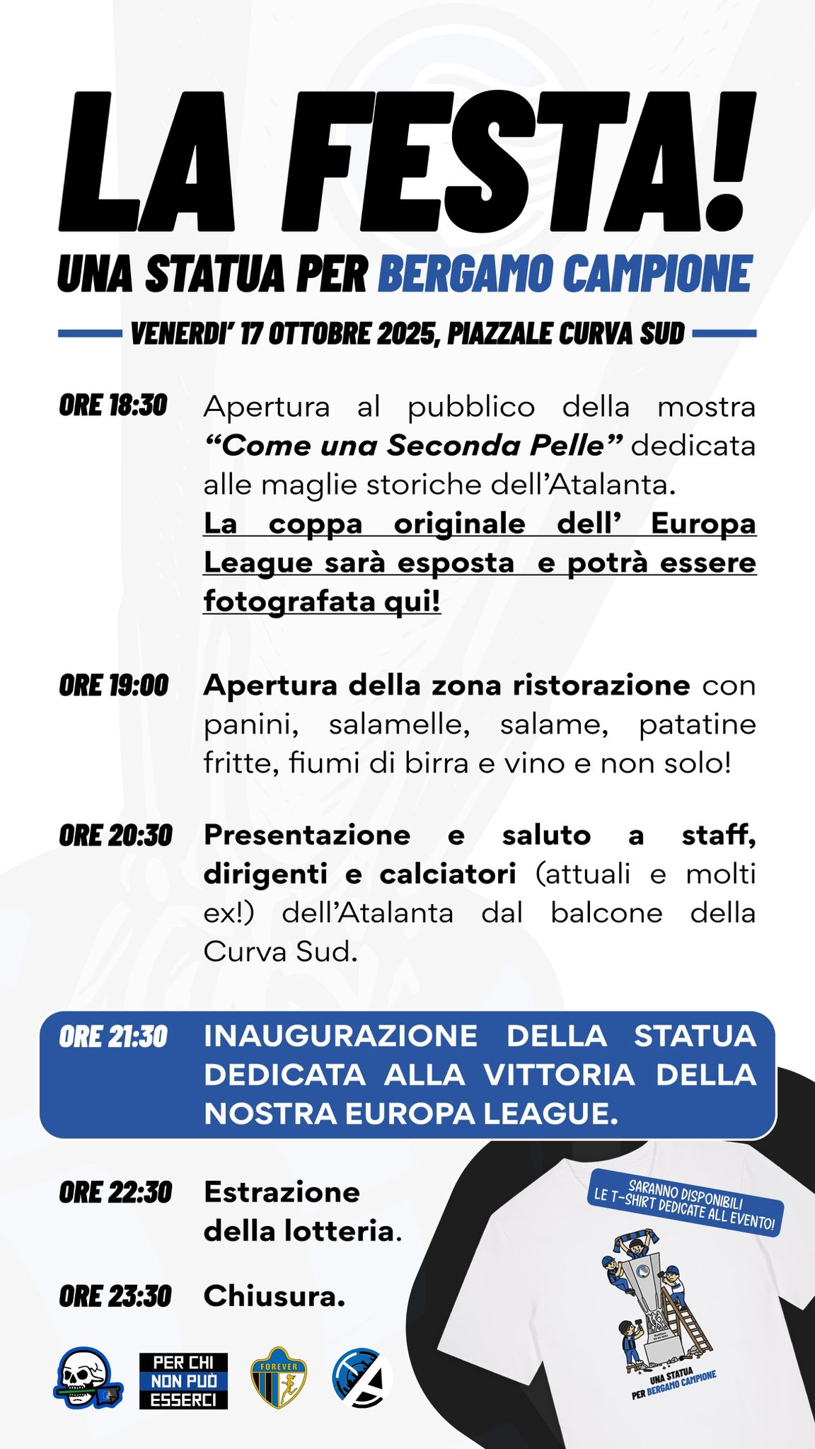 Alle 18.30 aprirà al pubblico la mostra “Come una seconda pelle”, esposizione di maglie storiche dell’Atalanta che sarà affiancata dal trofeo originale dell’Europa League (con cui si potranno scattare delle foto) conservato a Zingonia. Alle 19 aprirà poi la zona ristorazione, con panini, salamelle, salame, patatine fritte, birra e vino, mentre alle 20.30 arriveranno staff, dirigenti e calciatori dell’Atalanta di oggi e del passato sul balcone della Morosini.