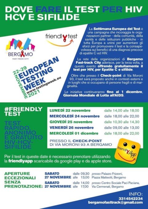 Da lunedì 22 novembre a mercoledì 1 dicembre anche a Bergamo, in diversi luoghi della città, si potranno effettuare test rapidi, anonimi e gratuiti per la diagnosi dell’HIV, del virus dell’epatite C e della sifilide.
