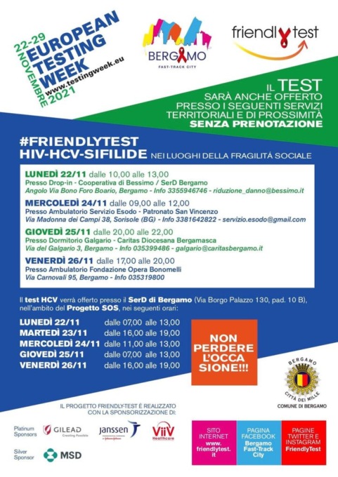 La rete delle organizzazioni di Bergamo Fast-track City ha infatti aderito, per la terza volta, alla “Settimana europea del test”, una campagna che incoraggia partner di tutta Europa a unirsi per promuovere la consapevolezza sui benefici di una diagnosi precoce di queste malattie. Oltre che al check-point di via Moroni 93, il test sarà proposto anche in altri luoghi di Bergamo, tra cui quelli che si occupano in particolare di persone fragili e che vivono in condizioni di marginalità.