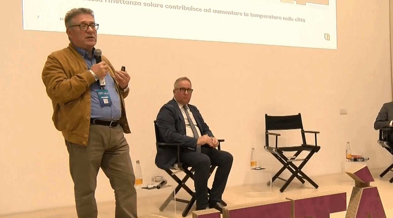 Marco Sandri, direttore tecnico i.build di Heidelberg Materials, ha illustrato le caratteristiche della pavimentazione i.idro Drain, che consente il riciclo naturale dell’acqua e presenta proprietà termiche significative. “Ha un colore bianco o simil bianco che rifrange molto di più rispetto a una comunissima pavimentazione in asfalto”, ha precisato Sandri, spiegando come questo si traduca in temperature percepite più basse.