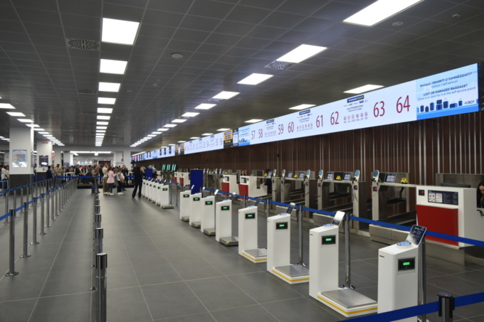 L’area check-in aggiunge spazi alle sale contigue già esistenti. Ospita trenta nuovi banchi di accettazione, di cui 22 in modalità “self drop”. Ovvero fai da te. Basta posizionare la carta d’imbarco sull’apposito visore e viene restituito il tagliando da mettere sul bagaglio. Con una “pistola” s’inquadra il codice e barre e la valigia, posta sul nastro trasportatore, parte verso l’aereo di destinazione.