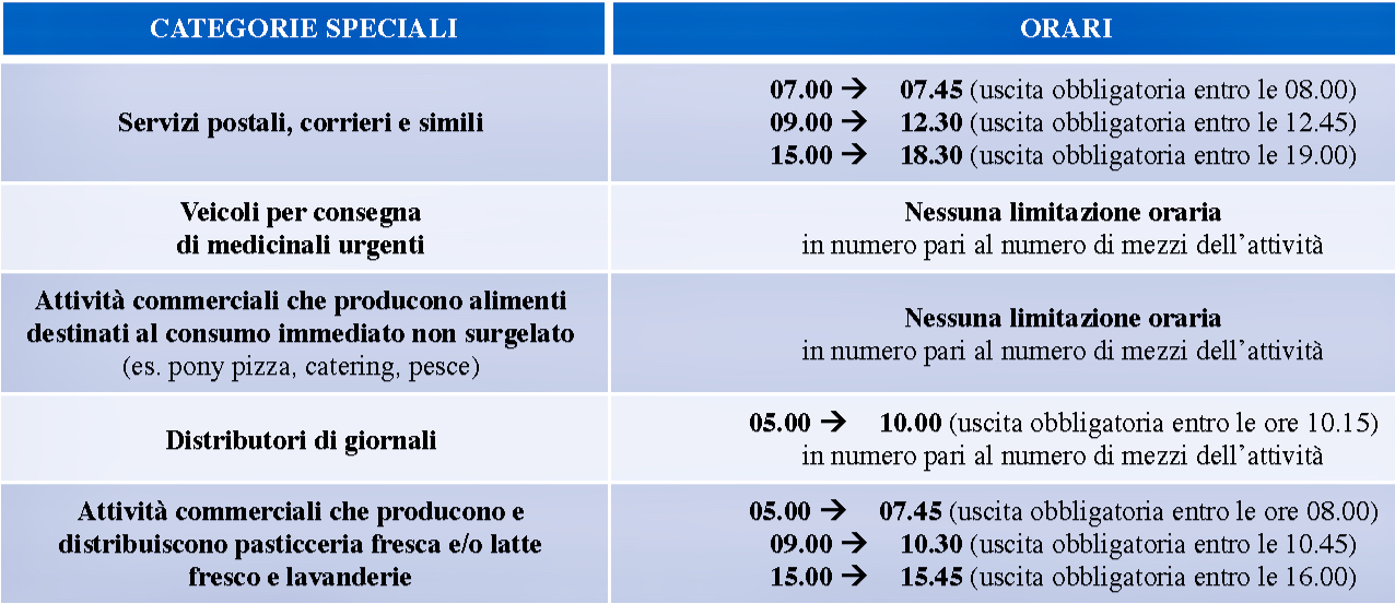 Innanzitutto cambieranno gli orari d’accesso. I veicoli con contrassegno carico e scarico potranno arrivare in Città Alta in tre fasce orarie. Due mattutine e una pomeridiana. La prima, tutti i giorni dalle 7 alle 7.45 con obbligo di uscire dalla Ztl entro le 8. La seconda, tutti i giorni dalle 9 alle 10.30 con obbligo di uscire dalla Ztl entro le 10.45. La terza, tutti i giorni dalle 15 alle 15.45 con l’obbligo di uscire dalla Ztl entro le 16. Ci sono poi disposizioni diverse per le categorie speciali che vedete qui sotto.