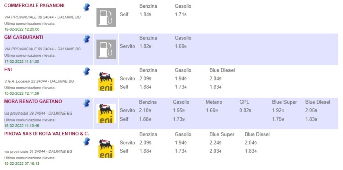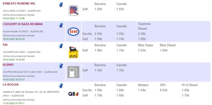 Nella galleria sottostante, i distributori meno cari a Bergamo, Seriate, Dalmine e Albino.