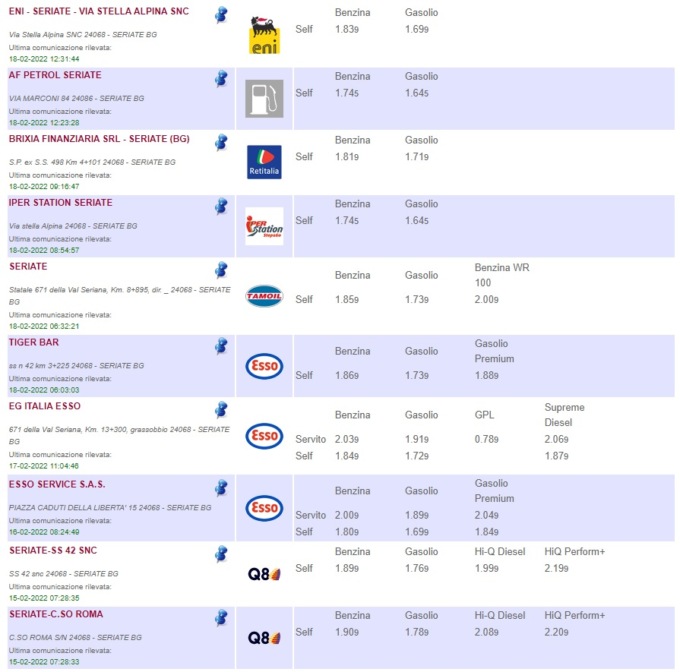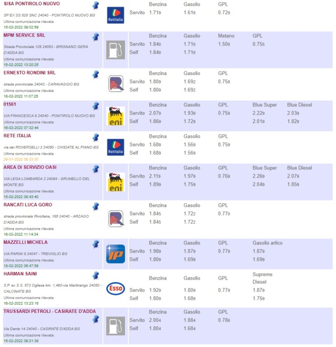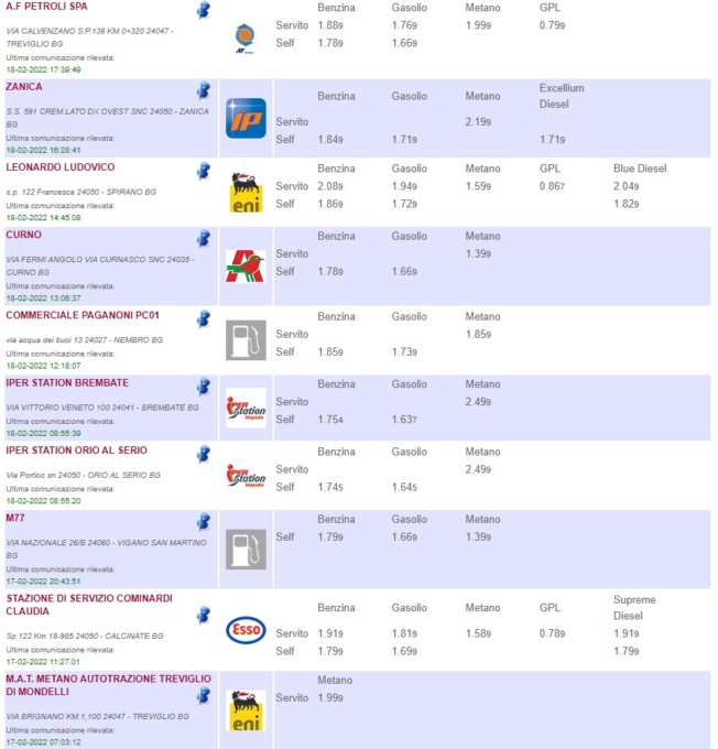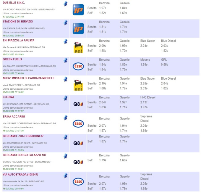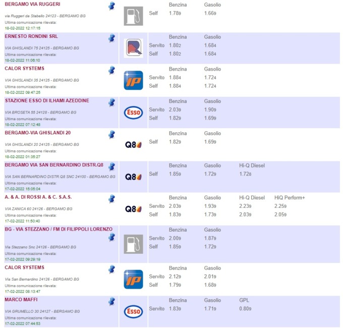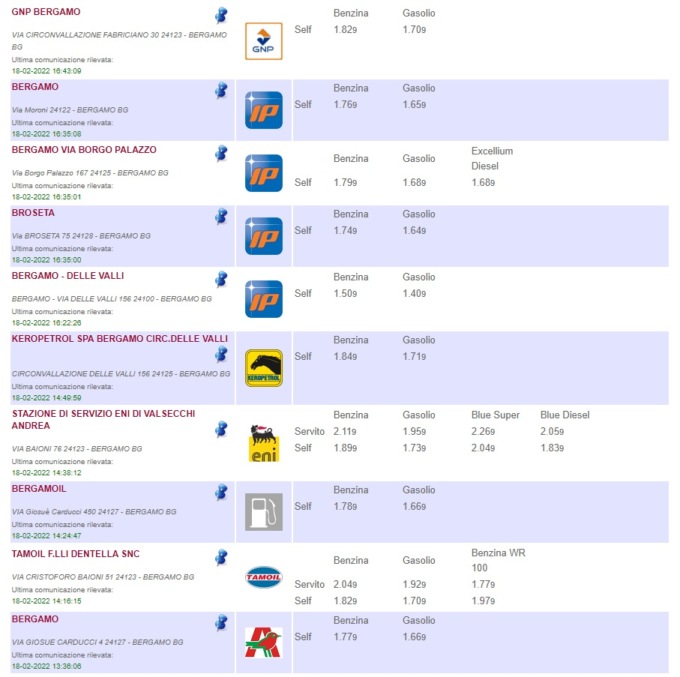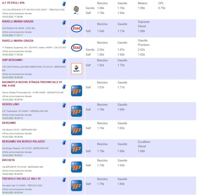 Sull’apposito sito del Ministero è possibile consultare l’elenco completo di tutti i distributori di benzina della provincia di Bergamo, con tanto di indirizzo del comune in cui si trovano, prezzi di vendita e tipologia di carburante offerto (QUI)