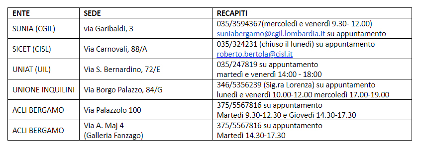 Il richiedente inoltre, per l’assistenza nella compilazione e/o nella trasmissione della domanda, può avvalersi della collaborazione dei centri autorizzati di assistenza fiscale (Caaf) e/o di altri soggetti senza fini di lucro, ubicati nel Comune di Bergamo e di seguito indicati, sempre su appuntamento: