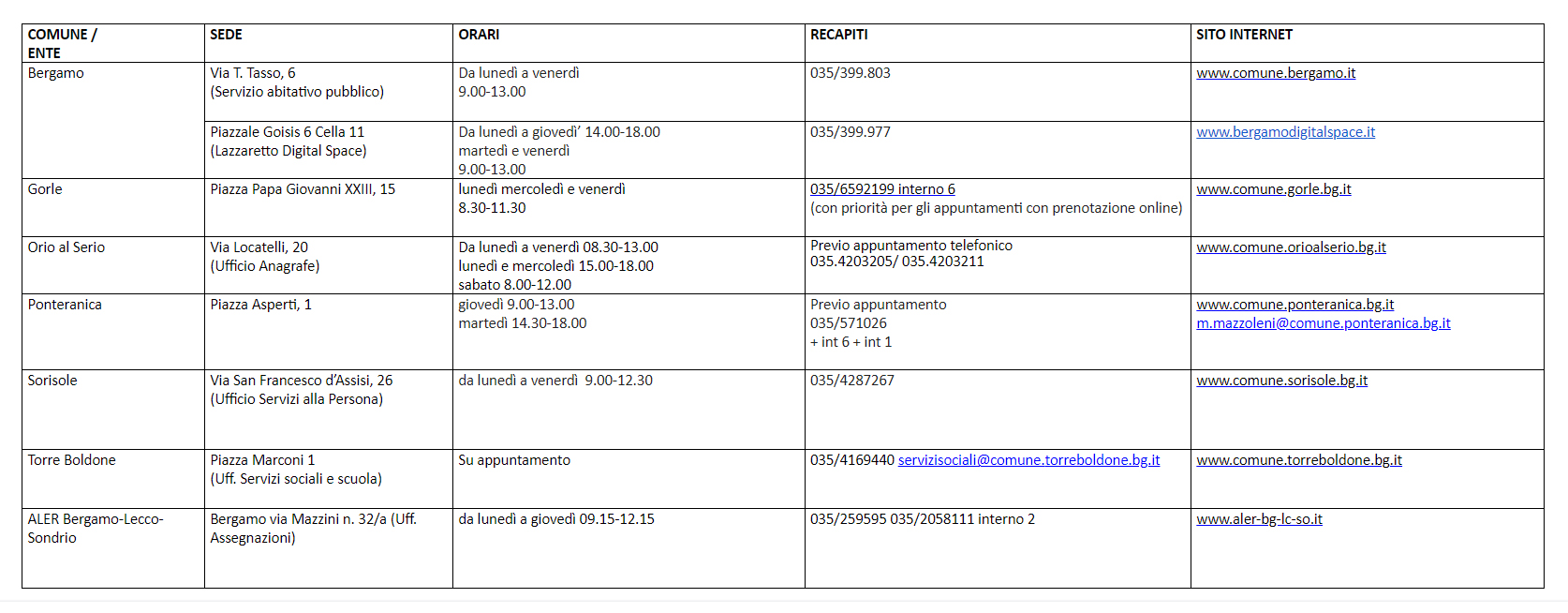 I cittadini interessati a partecipare possono prendere visione dell’Avviso Pubblico sui siti istituzionali dei Comuni appartenenti all’Ambito; per il Comune di Bergamo a questo link, oppure sul sito di Aler Bergamo-Lecco-Sondrio a questo link.