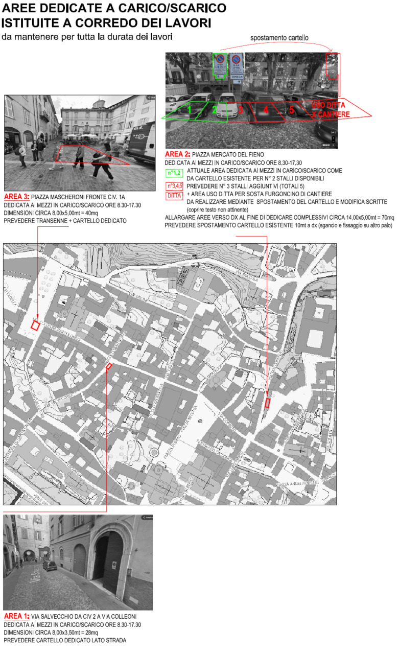 - In via Salvecchio, nel tratto compreso tra il civico 2 e via Colleoni, in piazza Mascheroni sul lato opposto al civico 1 e in piazza Mercato del Fieno lungo il lato adiacente a via San Lorenzo, divieto di sosta permanente con rimozione forzata, salvo mezzi per carico/scarico merci (max 60 minuti);