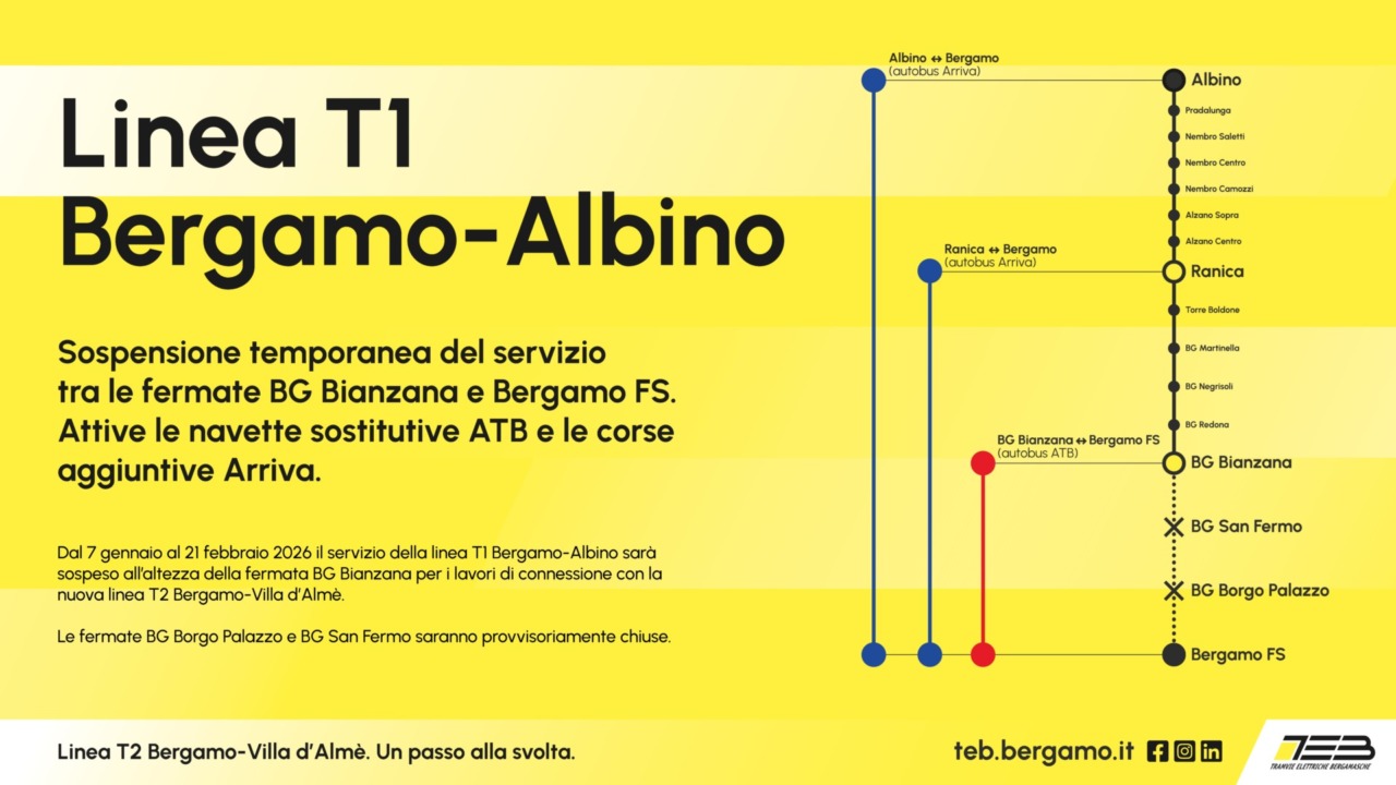 Fino al 21 febbraio 2026, i passeggeri della linea T1 potranno comunque contare su un servizio sostitutivo di autobus Atb nel tratto compreso tra Bianzana e Bergamo Fs.