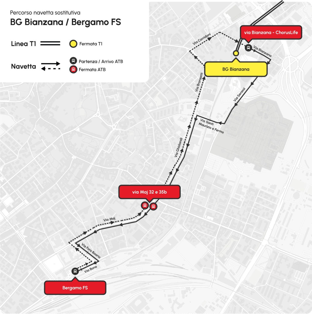 Le navette, in entrambe le direzioni, faranno un’unica fermata intermedia in via Angelo Maj, ai civici 32 e 35b, davanti e di fronte alla scuola d’arte Fantoni. Per tutto il periodo del cantiere, le fermate Borgo Palazzo e San Fermo resteranno chiuse. Saranno sostituite dalle nuove fermate provvisorie in via Angelo Maj e in via Bianzana (davanti a ChorusLife), raggiungibili comodamente a piedi.