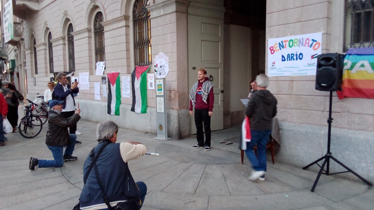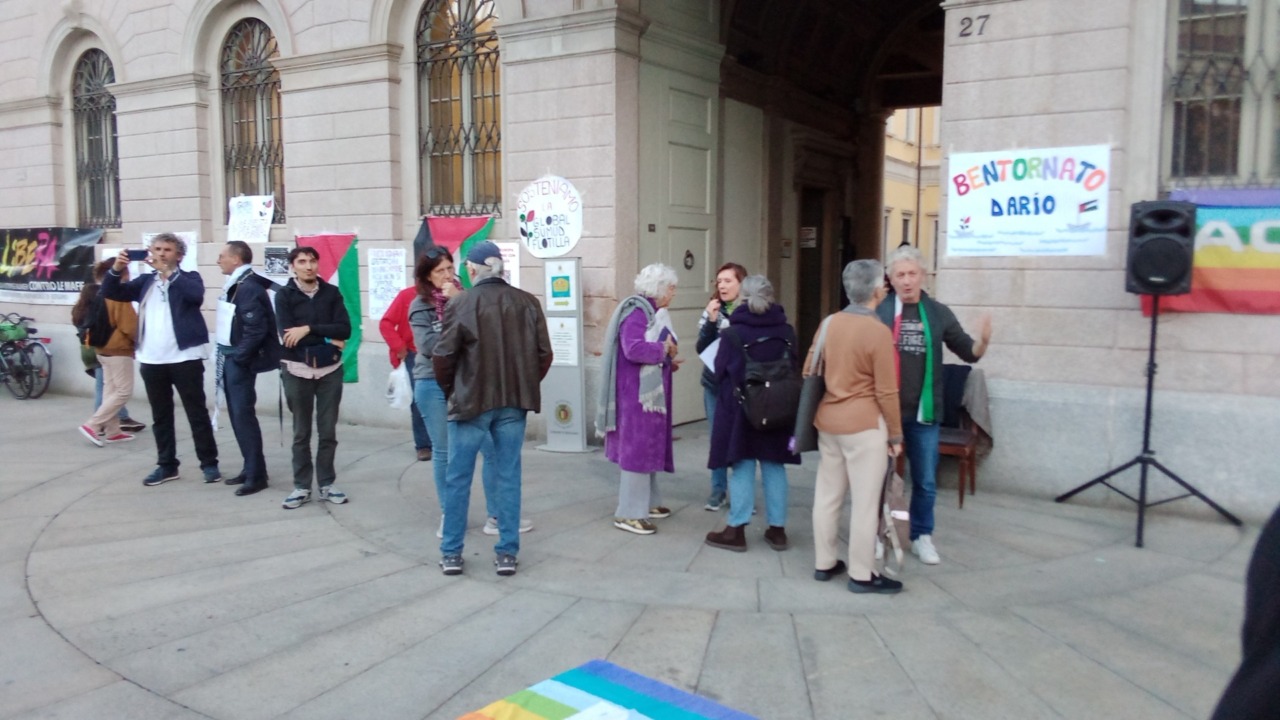 «Bentornato Dario». Un cartello colorato campeggia sull’ingresso di Palazzo Frizzoni. Davanti un centinaio di persone in attesa. Buona parte della giunta comunale. Tanti striscioni e poi gli applausi. Dario Crippa si è presentato questa sera 7 ottobre al presidio pro-Palestina, che si trova da 37 giorni sotto la sede del Comune, nel centro di Bergamo.