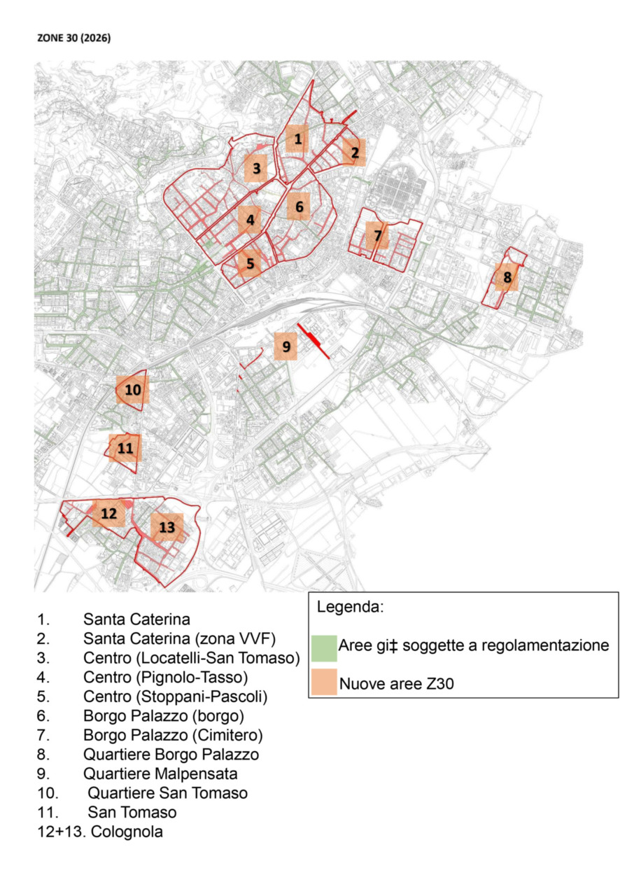 - Centro – Locatelli, San Tomaso (via dei Capoferro, via Zambelli, via Vigliani, via Monte Ortigara, via Cornasello, via Brigata Lupi, piazzale della Repubblica, via Zelasco, via Masone, via Matris Domini, via Zambianchi, viale Albini, via Cornasello, via Pradello, via S. Elisabetta, via Pignolo, piazzetta del Delfino, via San Tomaso, vicolo S. Tomaso, via Pelabrocco, vicolo Pelabrocco, via Noca, piazza Carrara);