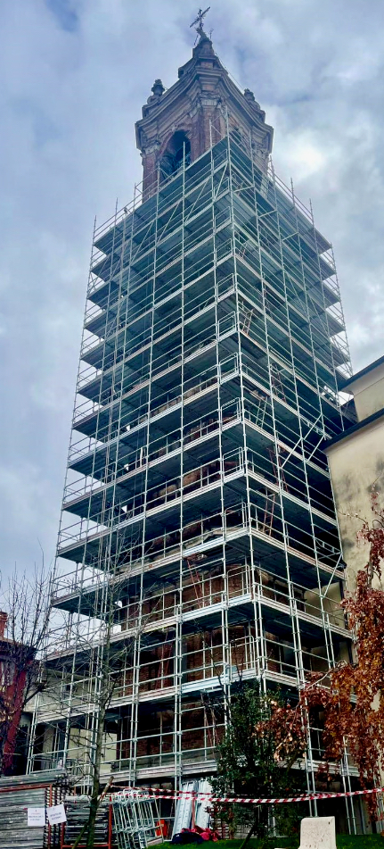 Il distacco di un pezzo di decorazione ha imposto un intervento immediato sul campanile barocchetto di Osio Sopra, oggi avvolto dal ponteggio necessario alla messa in sicurezza. Un frammento di mattoncini rossi e pietra è crollato dall’arco sopra la cella campanaria.