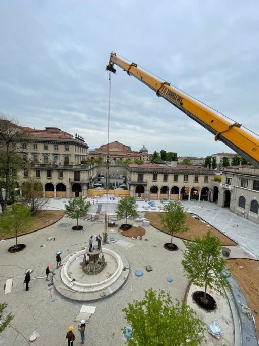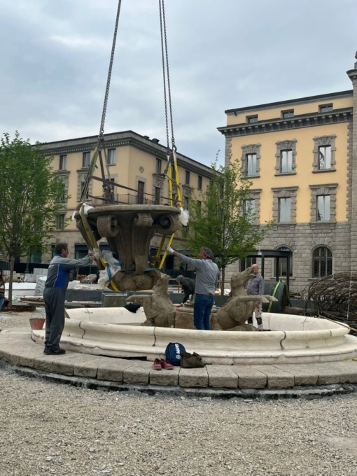 Dopo essere stata smontata a giugno del 2020 ed essere stata custodita in un magazzino comunale, la fontana del Tritone ha fatto “ritorno a casa”. Il monumento, realizzato in in ceppo Lombardo e marmo bianco di Zandobbio, è stato ricollocato nei giorni scorsi al centro di piazza Dante, completamente rinnovata nell’aspetto.