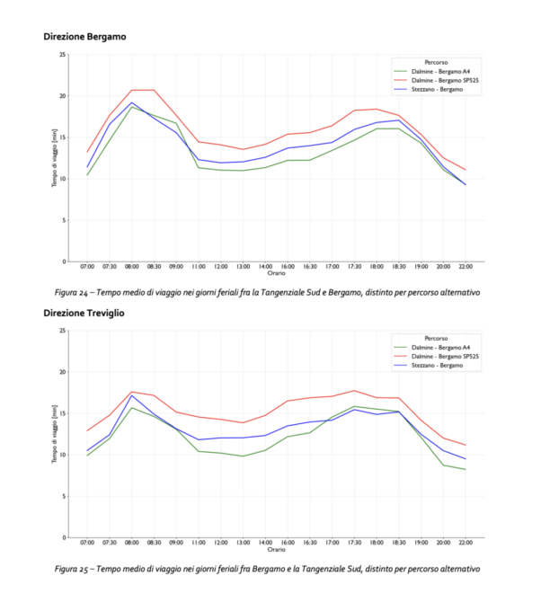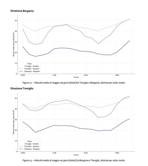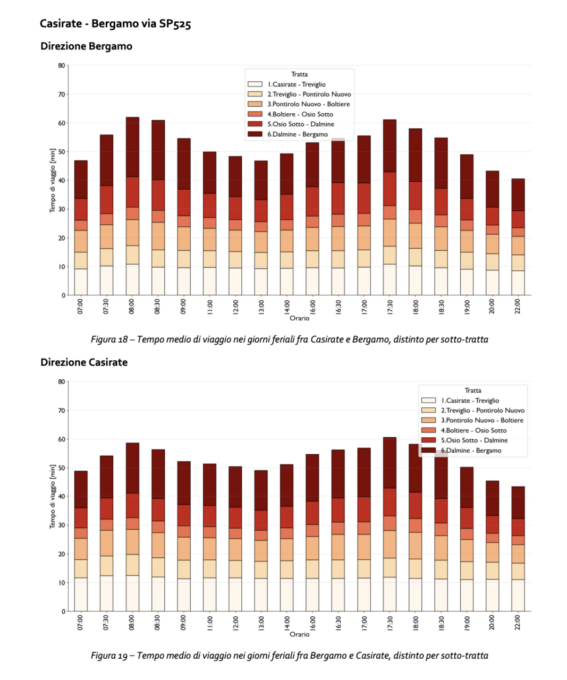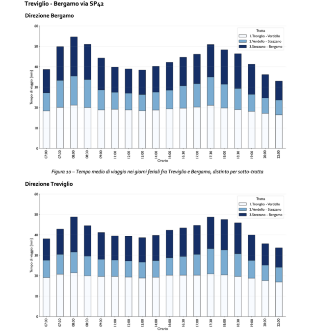Fatta questa premessa metodologica, i risultati mostrano come i tempi di percorrenza tra Bergamo e Treviglio sono variabili, ma le due strade principali – la SP42 e la SP525 – offrono prestazioni simili, con velocità medie equivalenti.  Gli spostamenti fra Bergamo e la pianura verso Treviglio sono affetti da problemi di congestione soprattutto nei giorni feriali durante le ore di punta del mattino e della sera con effetti di congestione che peggiorano man mano che ci si avvicina a Bergamo. Il traffico massimo viene registrato fra la Tangenziale Sud e il capoluogo. Su alcuni percorsi la congestione allunga il tempo di viaggio di quasi l’ottanta per cento rispetto al caso di assenza di traffico.