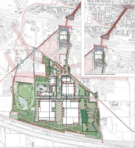 Dal punto di vista urbanistico, il masterplan propone un impianto di tipo cardo-decumano. L’asse nord-sud, concepito come boulevard urbano multifunzionale, rappresenta la dorsale principale dell’insediamento: a nord favorisce l’accessibilità e le relazioni tra i comparti, mentre a sud si trasforma progressivamente in un asse verde, con funzione ecologica e paesaggistica, in continuità con la fascia di mitigazione ambientale lungo la Brebemi.