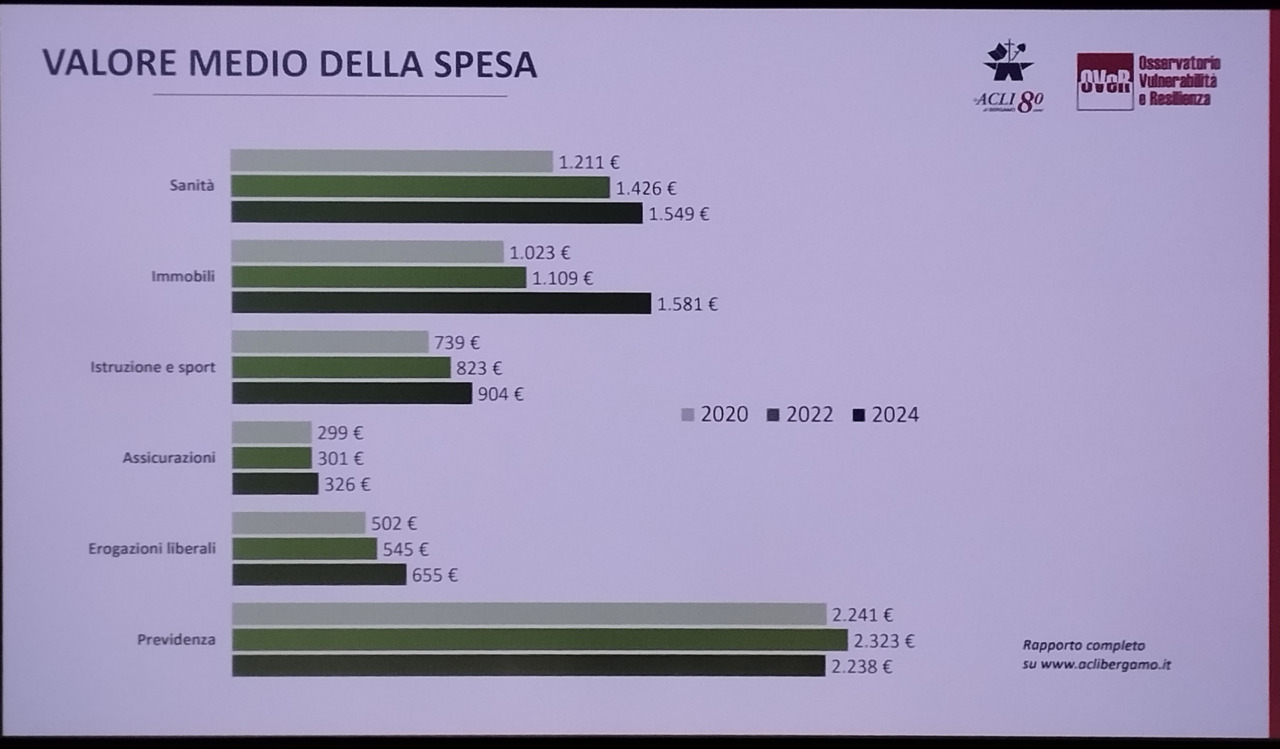 L’intervento del professor Pagnoncelli si è concentrato sul report annuale di OVeR – Osservatorio Vulnerabilità e Resilienza, promosso dalle Acli lombarde insieme all’Istituto per la Ricerca Sociale. I dati mostrano un aumento significativo delle spese per alloggio e sanità delle famiglie bergamasche.