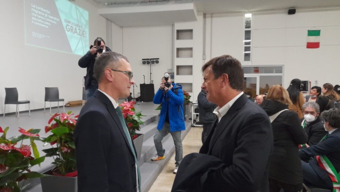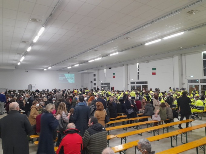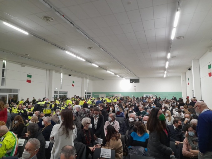 Dopo le proteste, l’evento organizzato da Ats si sta svolgendo regolarmente. A fare gli onori di casa il direttore Massimo Giupponi. «Semplicemente grazie, lo slogan di regione Lombardia per questi momenti di ringraziamento dei volontari, di chi ha contribuito in modo attivo all’organizzazione campagna vaccinale. Organizzazione partita da qui, perché il Palaspirà è stato il primo palazzetto nel quale l’allora responsabile della campagna vaccinale Guido Bertolaso scelse di attivare un hub vaccinale. Ringraziamo il sindaco Yuri Grasselli, al quale vanno i ringraziamenti per aver messo a disposizione questo spazio che abbiamo avuto modo di visitare il primo giorno con lo stesso Bertolaso. Ringraziamo però anche tutte le altre sedi di centri vaccinali, da Dalmine a Treviglio, Martinengo e Antegnate. Grazie al dottor Assembergs e al dottor Andrea Ghedi. Ricordiamo anche il grande lavoro dei nostri medici di medicina generale, che attraverso la loro cooperativa hanno gestito due centri vaccinali. Chiudo ricordando l’unico hub vaccinale aperto all’interno di un’impresa, la Same di Treviglio».