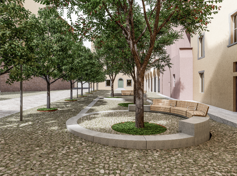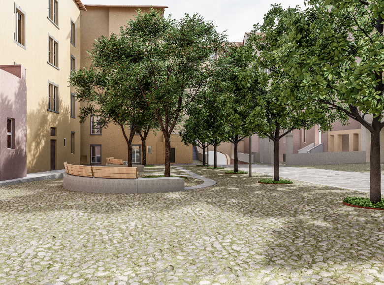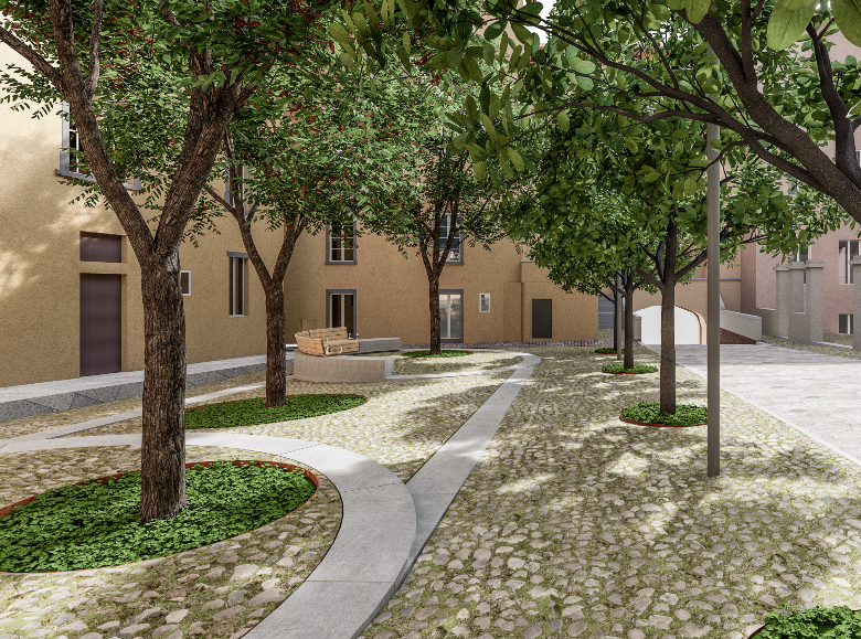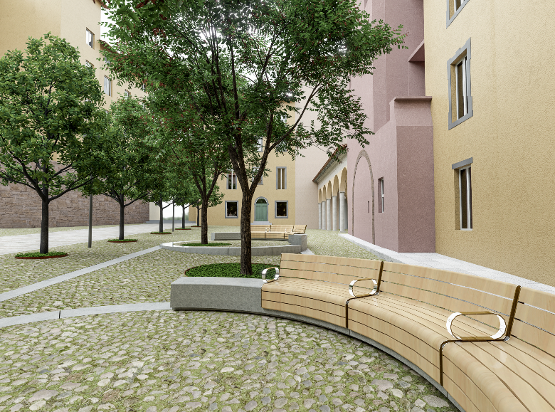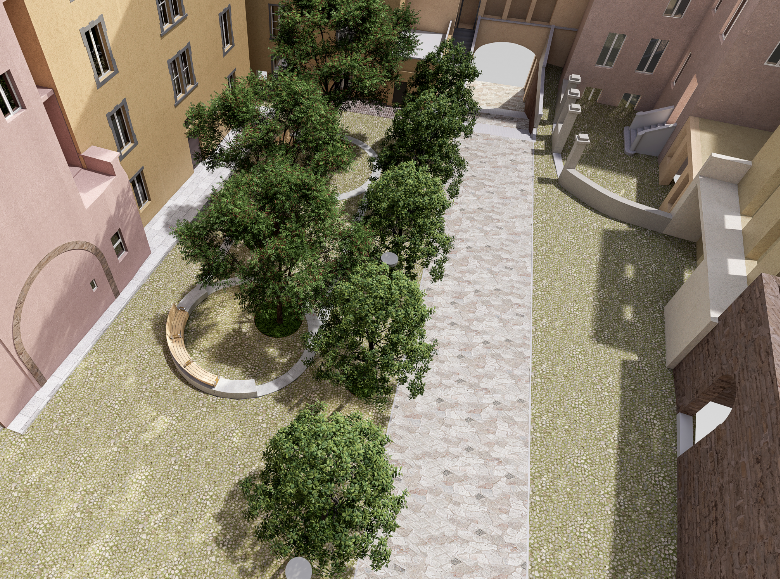 La possibilità di rifare completamente la pavimentazione ha aperto nuovi scenari. I carpini del filare, già selezionati con zolle importanti che avrebbero richiesto vasi delle dimensioni di quelli di via Tiraboschi, verranno ora interrati. Le “isole” non saranno più appoggiate ma incassate, con una forma unitaria pensata come contrappunto al lavatoio storico.