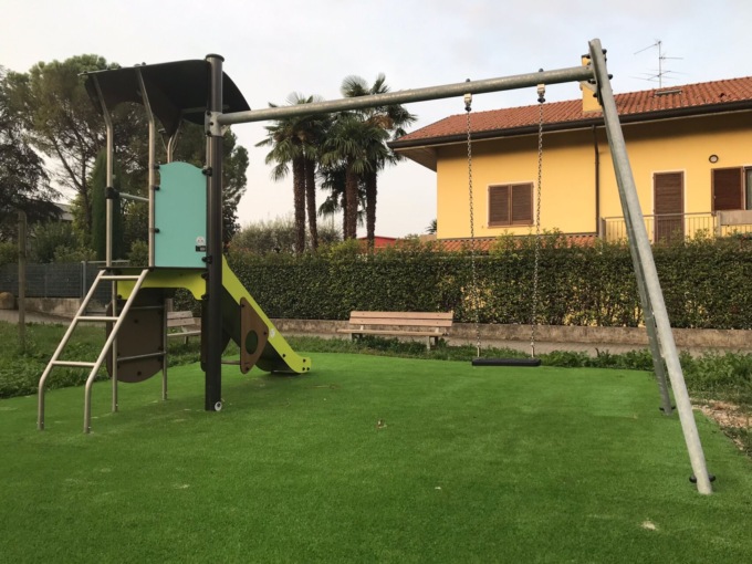Infine, in via Adamello è stata posata un’altalena a due posti, uno con seggiolino a tavoletta e uno con seggiolino a gabbia, correlata da pavimentazione anti-trauma in erba sintetica.