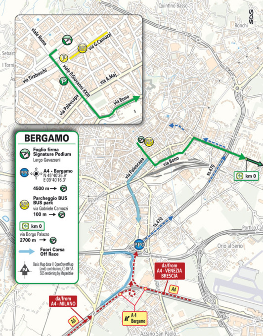 Modifiche alla viabilità anche nel centro di Bergamo per consentire la partenza del Giro di Lombardia, l’ultima delle cinque classiche della stagione ciclistica internazionale (nelle immagini, il percorso completo): partirà da viale Roma, in Porta Nuova, intorno alle 10 del mattino di domani, con passaggio da viale Papa Giovanni e via Bono, poi via Borgo Palazzo in direzione Seriate. Subito dopo (sulle strade di Bergamo i ciclisti transiteranno per meno di 10 minuti) inizieranno le operazioni di smontaggio degli spazi della partenza: entro la mattinata di domani la situazione dovrebbe tornare normale. Il Comune di Bergamo ha consigliato, quando possibile, l’utilizzo di mezzi alternativi all’auto per recarsi nel centro città e nel centro storico.