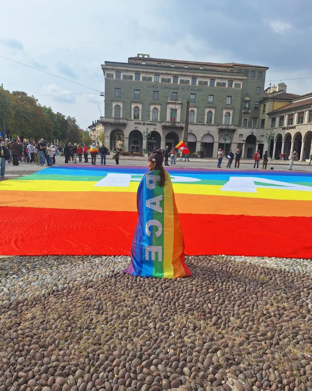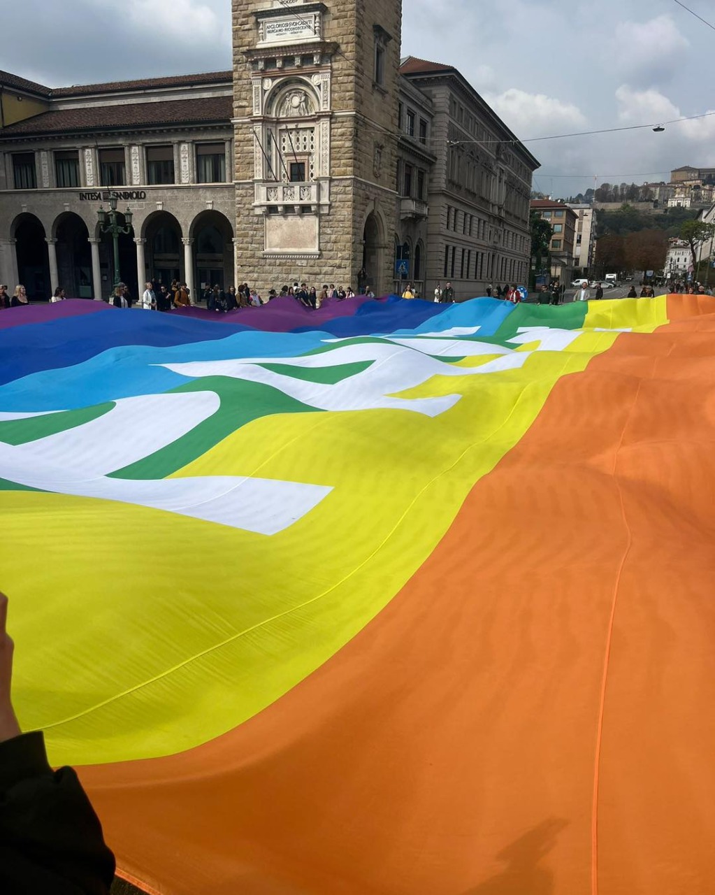 Anche il Comune di Bergamo ha voluto, a suo modo, partecipare alla manifestazione. All’esterno di Palazzo Frizzoni è stato infatti appeso un grande striscione raffigurante le bandiere di Palestina, Ucraina e della pace.