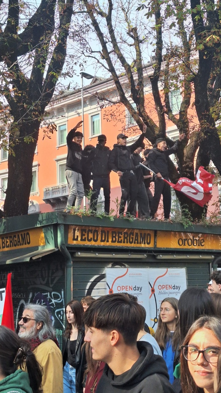Poco dopo mezzogiorno una parte dei manifestanti, quelli che fanno capo a Usb con numerosi studenti, è arrivata alla stazione e ha occupato il binario 1 ovest per Milano e impedendo la partenza di un treno per Treviglio. Erano in centinaia, sul sedime, con striscioni e fumogeni. In centro, al momento dello scioglimento della parte del corteo della Cgil, le Acli hanno steso in piazza Vittorio Veneto la maxi bandiera della pace che nei giorni scorsi era stata appesa alle Mura.