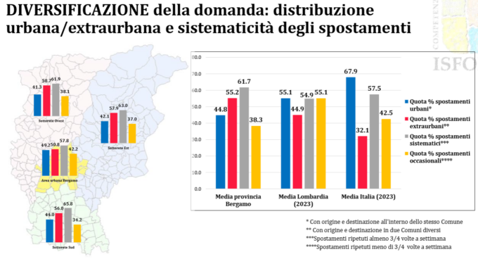 L’analisi ha anche rivelato un’evoluzione verso abitudini di mobilità più moderne e urbane, con un calo dei lunghi spostamenti quotidiani. Per di più, la provincia di Bergamo mostra una percentuale elevata di spostamenti extraurbani (circa il 55 per cento), ossia viaggi che iniziano e hanno fine entro le vicine reti comunali, favorita dalla configurazione stessa del territorio.