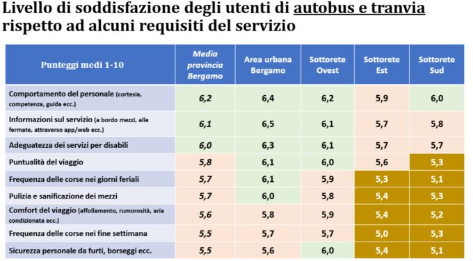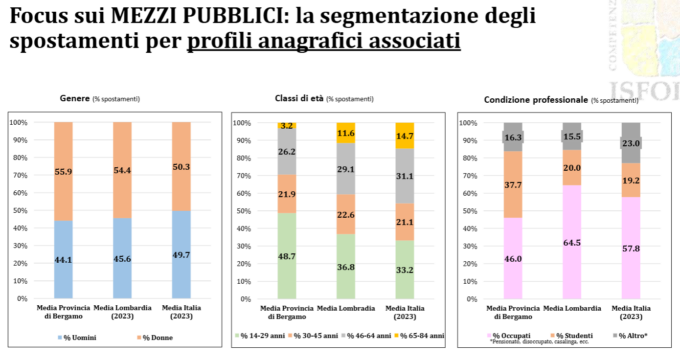 Riguardo ai mezzi di trasporto più utilizzati per spostarsi nel bacino bergamasco, oltre la metà degli spostamenti avviene in auto, mentre solo il 6,7 per cento utilizza i mezzi pubblici. Focalizzandosi su questi ultimi, è emerso che più della metà dei viaggi (55,9 per cento) è compiuta da uomini, in linea con i dati regionali e nazionali, principalmente di età compresa tra i 14 e i 29 anni e perlopiù studenti. Insomma, come ha detto Marino: «L’attuale situazione dei mezzi di trasporto pubblico in Bergamasca è un enorme scuolabus».