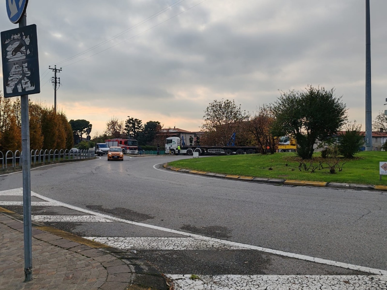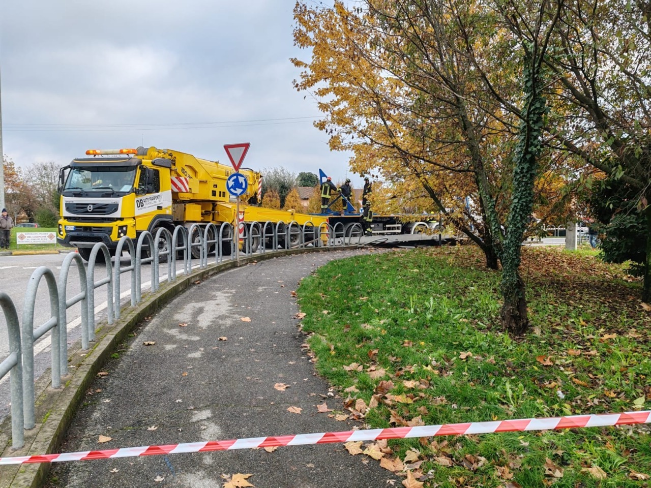 Erano circa le 14 quando, all’altezza della rotonda tra le strade provinciali 121 e 127 (via Facchinetti), un camion con trasporto eccezionale ha perso parte del grosso carico.