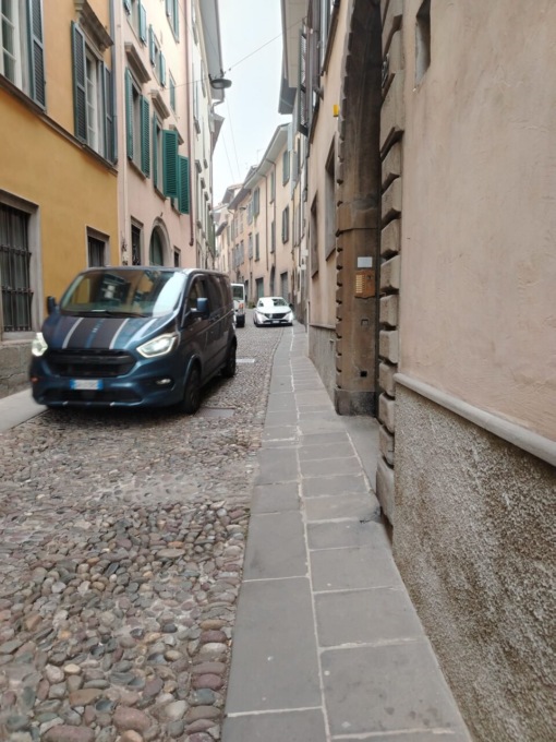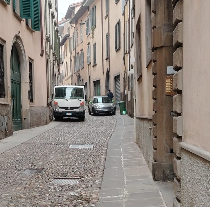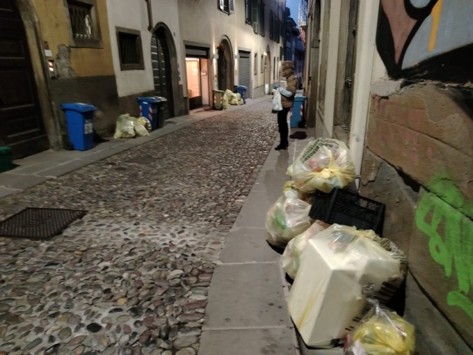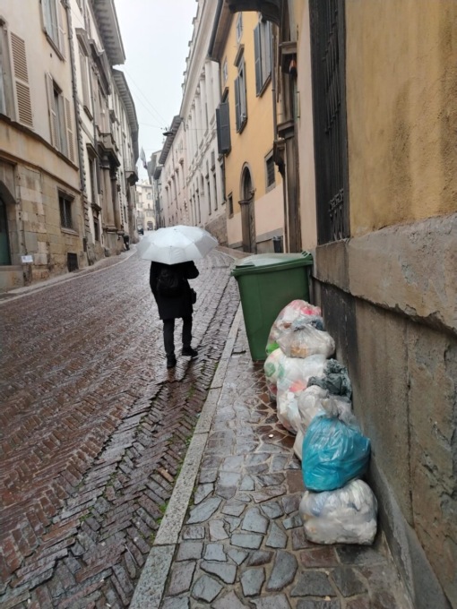 A questa situazione molto difficile si aggiunge la questione della spazzatura, che occupa pressoché tutto il marciapiede e chi cammina, nei centri storici, deve passare ai ciottoli o al porfido della strada. In strade come via Pignolo, via Masone o via San Tomaso questo avviene tre giorni la settimana per diverse ore. Al di là del discorso del decoro – che in un centro storico non è un argomento da trascurare -, non si vede perché la “rumenta” debba mettere a rischio i pedoni.