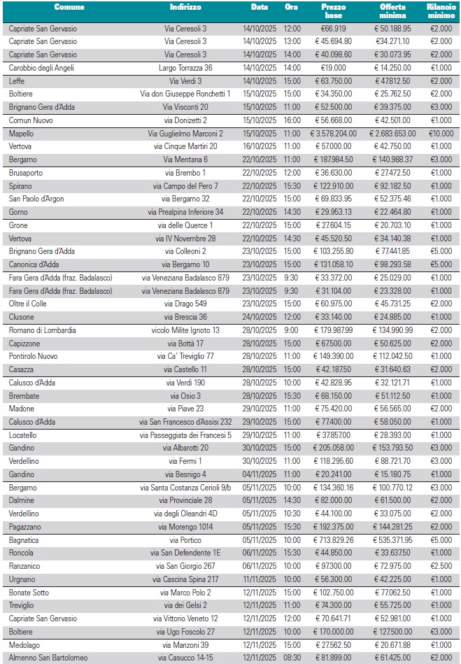 L’elenco completo delle case all’asta è sul PrimaBergamo in edicola fino a giovedì 16 ottobre 2025, o in edizione digitale QUI