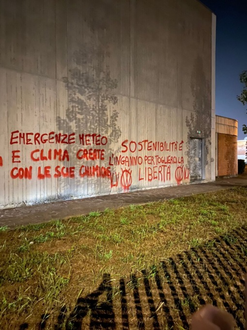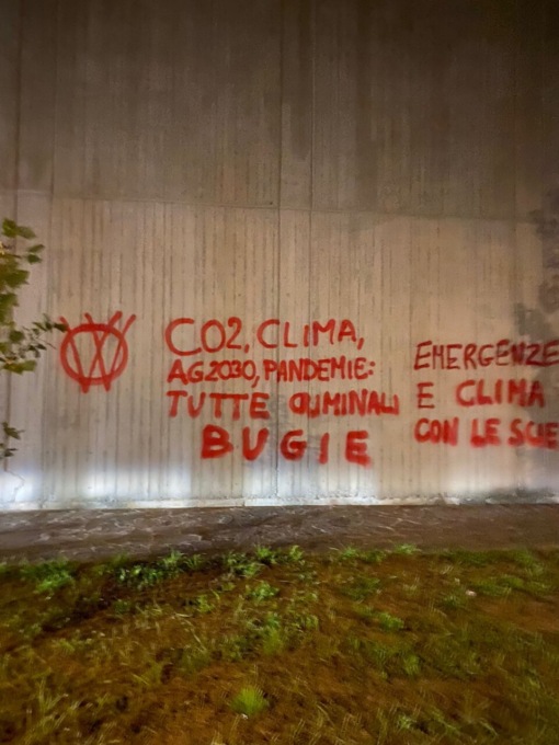 Le scritte, realizzate con vernice rossa, riportano messaggi controversi legati alla crisi climatica, alla sostenibilità e alla gestione delle emergenze meteorologiche, oltre a fare riferimento alla pandemia da Covid-19 e ad altre questioni globali. Frasi come «Emergenze meteo e clima create con le scie chimiche», «Sostenibilità è l’inganno per toglierci la libertà» e «CO2, clima, Ag2020, pandemie: tutte criminali bugie» denotano scetticismo e rifiuto verso le narrazioni scientifiche e istituzionali sulle emergenze ambientali e sanitarie.