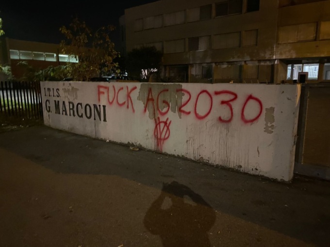 Nella serata di ieri (martedì 5 novembre), ignoti hanno imbrattato le mura esterne dell’Istituto Marconi di Dalmine con graffiti contenenti frasi di carattere negazionista e complottista.