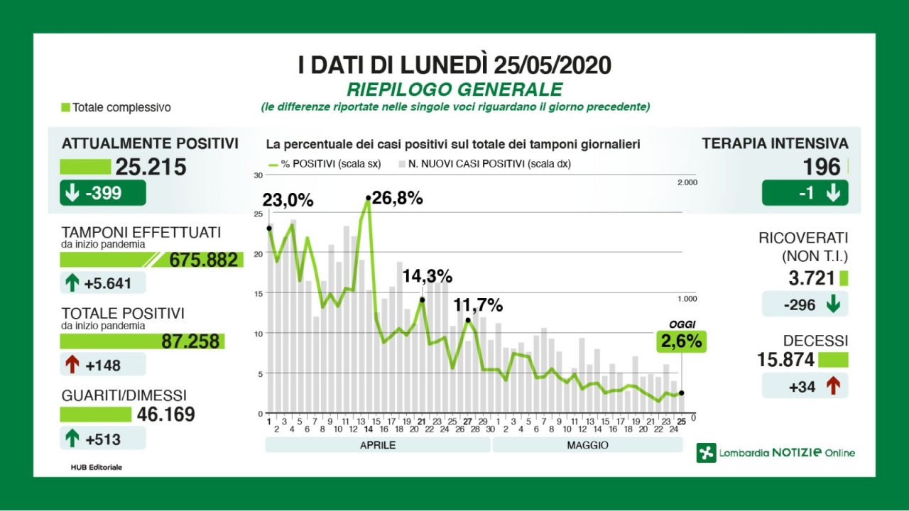 In tutta la Lombardia il totale dei positivi sale a 87258 persone: sono 148 i nuovi postivi registrati sul territorio regionale, a fronte di 5641 tamponi effettuati (ieri i nuovi positivi erano stati 285, con 11457 test effettuati). La percentuale dei casi positivi sul totale dei tamponi giornalieri è quindi pari al 2,6 per cento (ieri era del 2,5 per cento). Anche il numero di coloro che sono attualmente positivi risulta in calo, arrivato a quota 25215 persone (399 in meno).