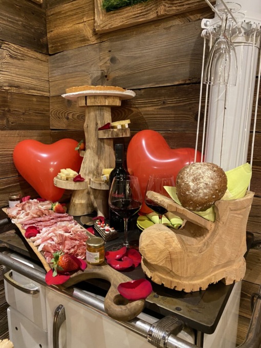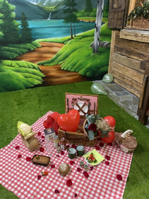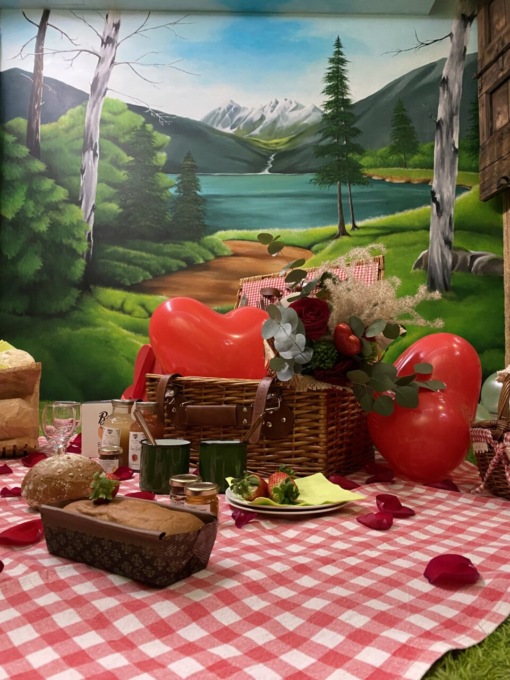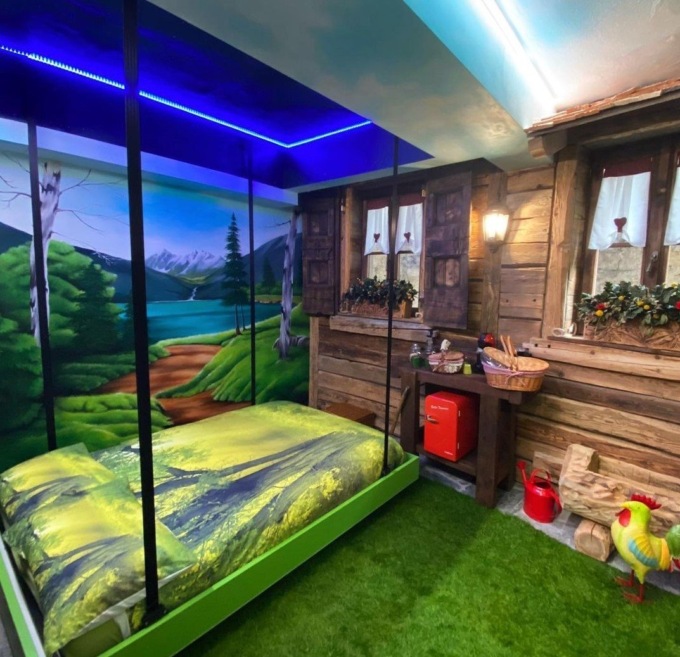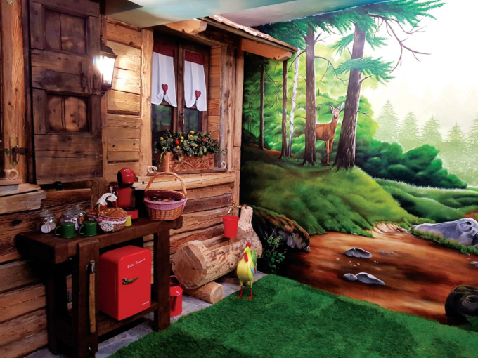Bastano pochi passi sul manto d’erba vera che ricopre il pavimento per sentirsi catapultati in quella che pare a tutti gli effetti una realtà parallela: le pareti, interamente dipinte a mano dal talento dell’artista Cristina Innocenti di Mozzo, trasmettono tutta la serenità e la magia di una piccola baita in mezzo al bosco.