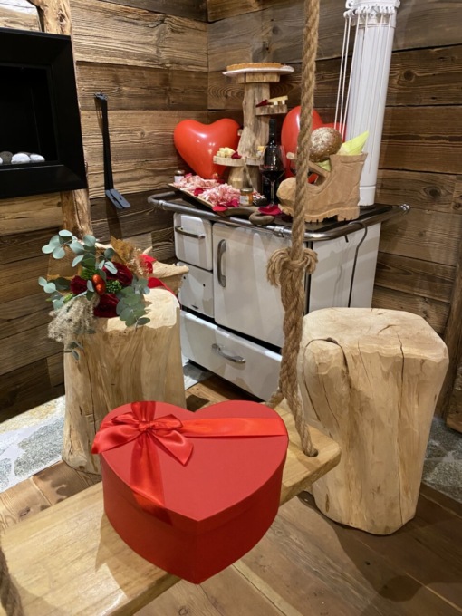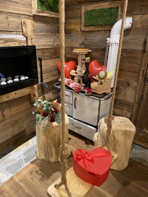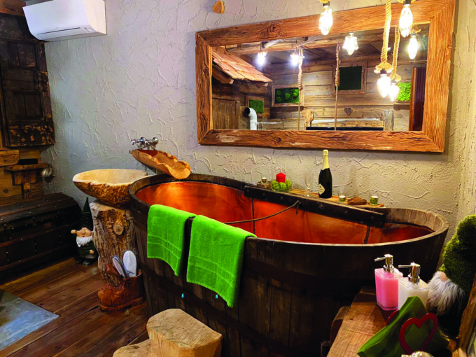 La sala relax, con altalena in legno, camino a bioetanolo e la sua vasca-tinozza d’altri tempi, è una vera coccola. Si dorme sotto un cielo stellato, nel comfort di un letto che scende direttamente dal soffitto premendo un semplice pulsante.