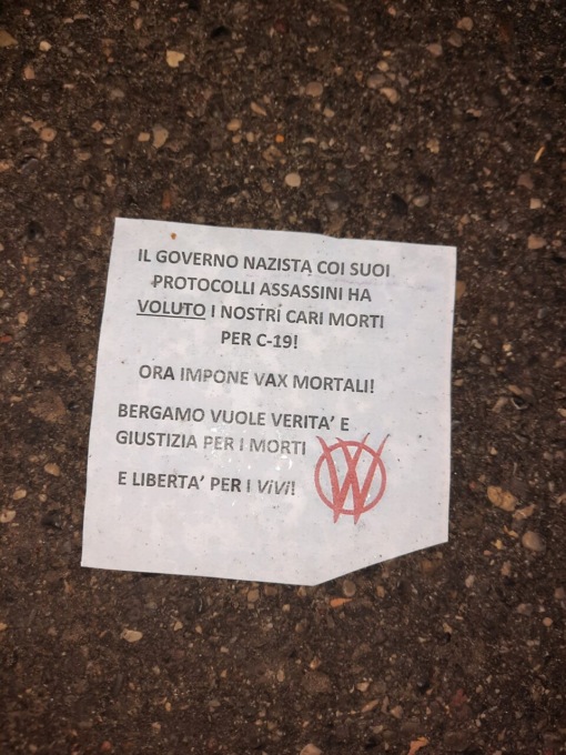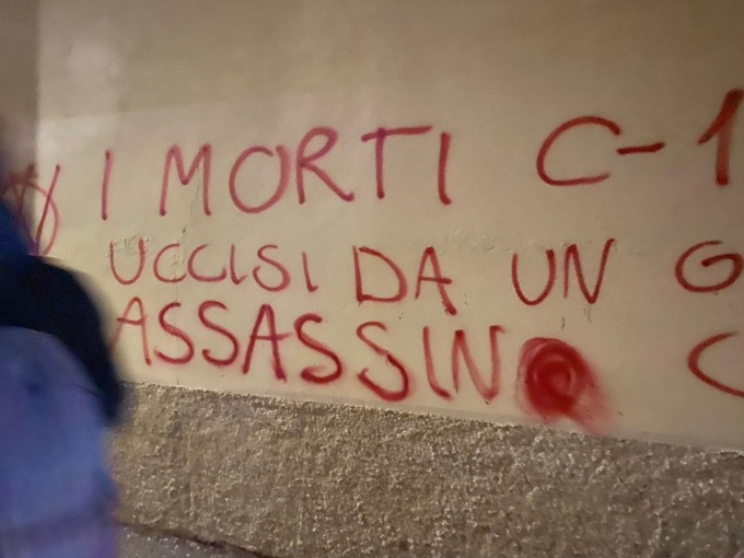 Le scritte recitano: «I morti Covid-19 qui sepolti [sono stati] uccisi da un governo nazista bugiardo assassino con protocolli criminali». E ancora: «Per loro rivendichiamo libertà e giustizia». Ancora una volta compare il simbolo dei no-vax, la “W” in un cerchio. Un nuovo affronto, dunque, alle vittime da Covid-19 che riposano nel cimitero di Nembro e uno sgarbo ai volontari che avevano ripulito le prime scritte il giorno seguente alla loro apparizione.