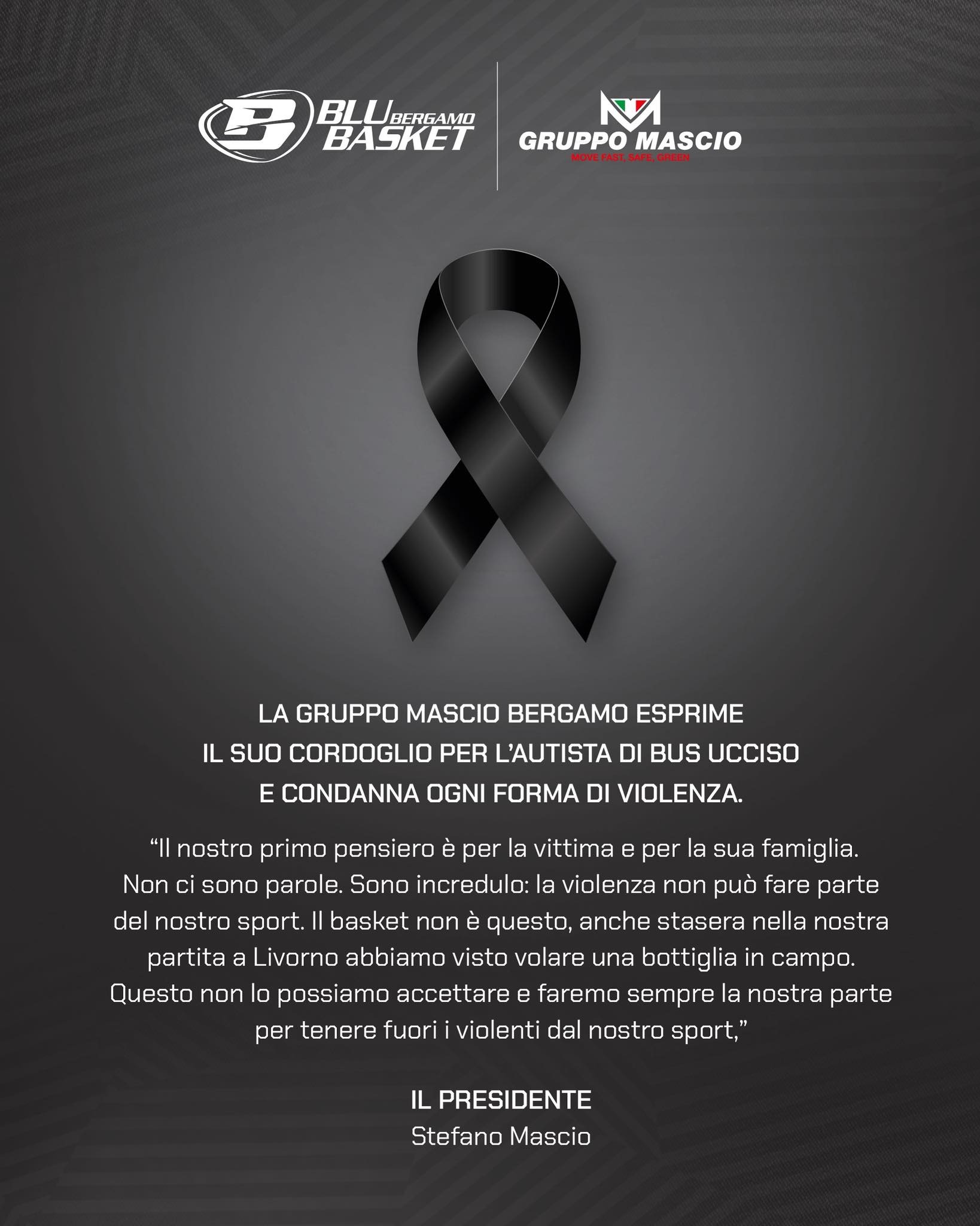 «Il Gruppo Mascio Bergamo esprime il suo cordoglio per l’autista di bus ucciso e condanna ogni forma di violenza – ha pubblicato sui social il presidente di Blu Basket Bergamo, Stefano Mascio -. Il nostro primo pensiero è per la vittima e la sua famiglia. Non ci sono parole. Sono incredulo: la violenza non può fare parte del nostro sport. Il basket non è questo, anche stasera nella nostra partita a Livorno abbiamo visto volare una bottiglia in campo. Questo non lo possiamo accettare e faremo sempre la nostra parte per tenere fuori i violenti dal nostro sport».