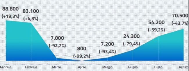 L’emergenza sanitaria ha avuto il sopravvento, soprattutto nel periodo primaverile, con un piccolo accenno di ripresa per i mesi estivi tra giugno e agosto, quando ci si è sentiti più liberi di muoversi e bisognosi di trascorrere un periodo di svago dopo la «reclusione» di mesi in casa. Anche alcuni voli domestici sono ripresi e qualcosa si è mosso. Nel complesso il dato giugno-agosto fa registrare, rispetto all’anno precedente, un -60,3 per cento per quanto riguarda gli arrivi e un -53,5 per cento per quanto riguarda le presenze.
