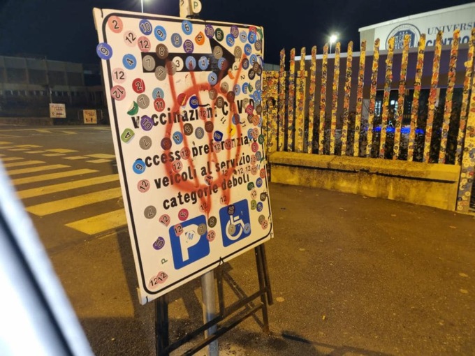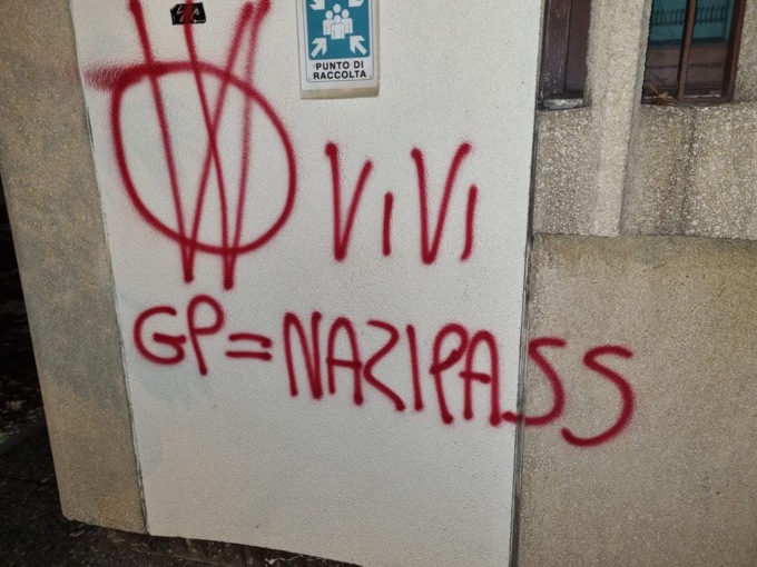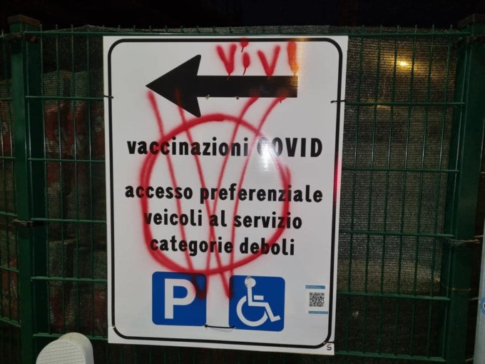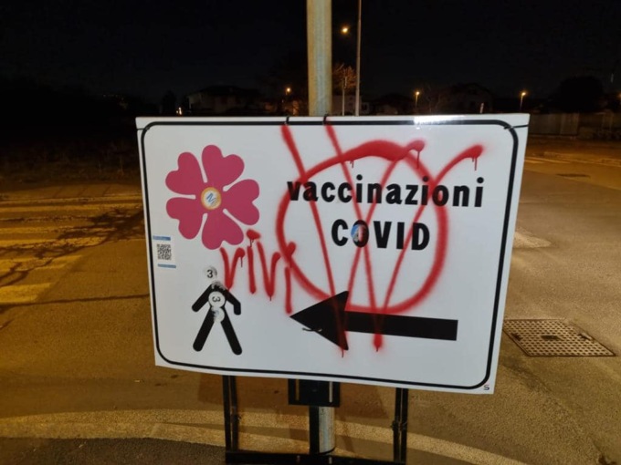 Sui muri esterni e sopra i cartelli della segnaletica sono comparsi, dipinti con vernice spray rossa, scritte contro l’efficacia dei vaccini e contro il Green Pass, definito «nazipass», affiancati dall’immancabile simbolo della W racchiusa all’interno di un cerchio. Accanto all’ingresso è ben visibile anche la frase «I vax uccidono», la stessa che aveva imbrattato il muro del cimitero di Nembro, mentre per terra non mancano le invettive contro il Governo, «Governo nazista, i vax uccidono», o gli ammonimenti ai neo genitori: «Salvate i vostri figli».
